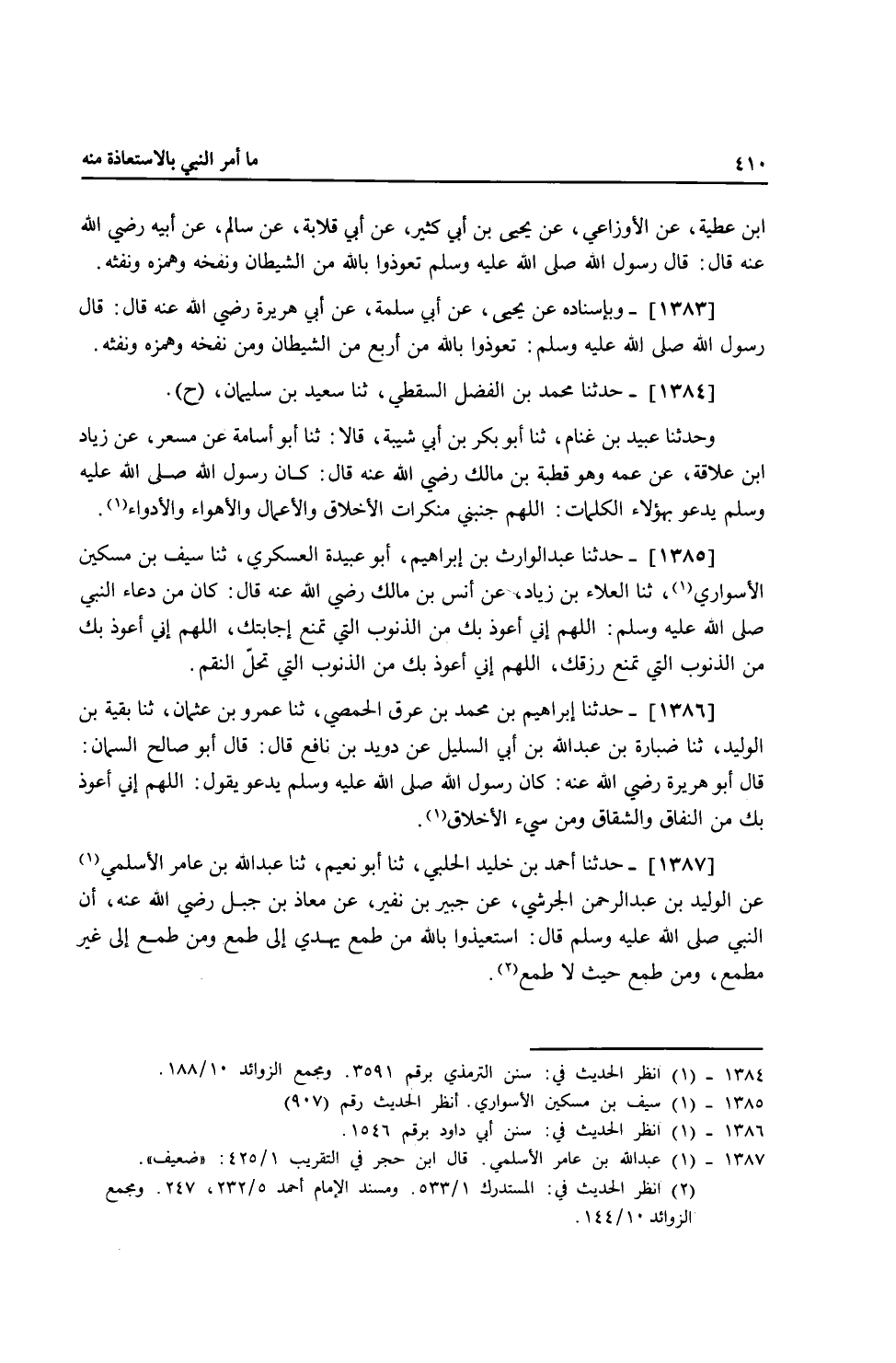 1384 - حَدَّثَنَا مُحَمَّدُ بْنُ الْفَضْلِ السَّقَطِيُّ، ثنا سَعِيدُ بْنُ سُلَيْمَانَ، ح وَحَدَّثَنَا عُبَيْدُ بْنُ غَنَّامٍ، ثنا أَبُو بَكْرِ بْنُ أَبِي شَيْبَةَ، قَالَا: ثنا أَبُو أُسَامَةَ، عَنْ مِسْعَرٍ، عَنْ زِيَادِ بْنِ عِلَاقَةَ، عَنْ عَمِّهِ، وَهُوَ قُطْبَةُ بْنُ مَالِكٍ رَضِيَ اللَّهُ عَنْهُ قَالَ: كَانَ رَسُولُ اللَّهِ صَلَّى اللهُ عَلَيْهِ وَسَلَّمَ §يَدْعُو بِهَؤُلَاءِ الْكَلِمَاتِ: «اللَّهُمَّ جَنِّبْنِي مُنْكَرَاتِ الْأَخْلَاقِ وَالْأَعْمَالِ وَالْأَهْوَاءِ وَالْأَدْوَاءِ»