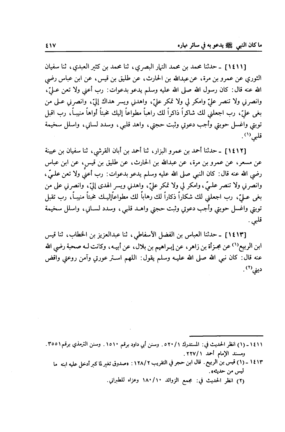 1411 - حَدَّثَنَا مُحَمَّدُ بْنُ مُحَمَّدٍ التَّمَّارُ الْبَصْرِيُّ، ثنا مُحَمَّدُ بْنُ كَثِيرٍ الْعَبْدِيُّ، ثنا سُفْيَانُ الثَّوْرِيُّ، عَنْ عَمْرِو بْنِ مُرَّةَ، عَنْ عَبْدِ اللَّهِ بْنِ الْحَارِثِ، عَنْ طَلِيقِ بْنِ قَيْسٍ، عَنِ ابْنِ عَبَّاسٍ، رَضِيَ اللَّهُ عَنْهُ قَالَ: كَانَ رَسُولُ اللَّهِ صَلَّى اللهُ عَلَيْهِ وَسَلَّمَ يَدْعُو بِدَعَوَاتٍ: «§رَبِّ أَعِنِّي وَلَا تُعِنْ عَلَيَّ وَانْصُرْنِي وَلَا تَنْصُرْ عَلَيَّ، وَامْكُرْ لِي وَلَا تَمْكُرْ عَلَيَّ، وَاهْدِنِي وَيَسِّرْ هُدَاكَ إِلَيَّ، وَانْصُرْنِي عَلَى مَنْ بَغَى عَلَيَّ، رَبِّ اجْعَلْنِي لَكَ شَاكِرًا ذَاكِرًا لَكَ رَاهِبًا مِطْوَاعًا إِلَيْكَ مُخْبِتًا أَوَّاهًا مُنِيبًا، رَبِّ اقْبَلْ تَوْبَتِي وَاغْسِلْ حَوْبَتِي وَأَجِبْ دَعْوَتِي، وَثَبِّتْ حُجَّتِي، وَاهْدِ قَلْبِي، وَسَدِّدْ لِسَانِي، وَاسْلُلْ سَخِيمَةَ قَلْبِي»