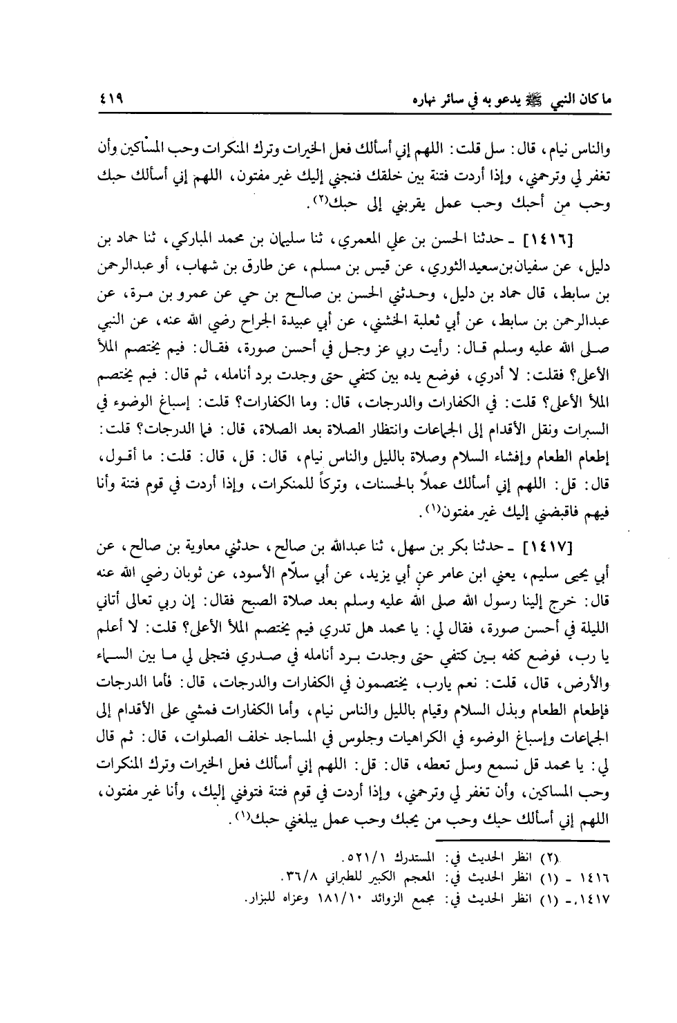 1417 - حَدَّثَنَا بَكْرُ بْنُ سَهْلٍ، ثنا عَبْدُ اللَّهِ بْنُ صَالِحٍ، حَدَّثَنِي مُعَاوِيَةُ بْنُ صَالِحٍ، عَنْ أَبِي يَحْيَى سُلَيْمٍ يَعْنِي ابْنَ عَامِرٍ عَنْ أَبِي يَزِيدَ، عَنْ أَبِي سَلَّامٍ الْأَسْوَدِ، عَنْ ثَوْبَانَ، رَضِيَ اللَّهُ عَنْهُ قَالَ: خَرَجَ إِلَيْنَا رَسُولُ اللَّهِ صَلَّى اللهُ عَلَيْهِ وَسَلَّمَ بَعْدَ صَلَاةِ الصُّبْحِ فَقَالَ: إِنَّ رَبِّي تَعَالَى أَتَانِي اللَّيْلَةَ فِي أَحْسَنِ صُورَةٍ فَقَالَ لِي: «يَا مُحَمَّدُ، هَلْ تَدْرِي §فِيمَ يَخْتَصِمُ الْمَلَأُ الْأَعْلَى؟» قُلْتُ: لَا أَعْلَمُ يَا رَبِّ، فَوَضَعَ كَفَّهُ بَيْنَ كَتِفَيَّ حَتَّى وَجَدْتُ بَرْدَ أَنَامِلِهِ فِي صَدْرِي، فَتَجَلَّى لِي مَا بَيْنَ السَّمَاءِ وَالْأَرْضِ، قَالَ: قُلْتُ: نَعَمْ يَا رَبِّ يَخْتَصِمُونَ فِي الْكَفَّارَاتِ وَالدَّرَجَاتِ قَالَ: «فَأَمَّا الدَّرَجَاتُ فَإِطْعَامُ الطَّعَامِ، وَبَذْلُ السَّلَامِ، وَقِيَامٌ بِاللَّيْلِ وَالنَّاسُ نِيَامٌ، وَأَمَّا الْكَفَّارَاتُ فَمَشْيٌ عَلَى الْأَقْدَامِ إِلَى الْجَمَاعَاتِ، وَإِسْبَاغُ الْوُضُوءِ فِي الْكَرَاهِيَّاتِ، وَجُلُوسٌ فِي الْمَسَاجِدِ خَلْفَ الصَّلَوَاتِ» ، قَالَ: ثُمَّ قَالَ لِي: «يَا مُحَمَّدُ، قُلْ نَسْمَعْ وَسَلْ تُعْطَهْ» ، قَالَ: قُلِ: «اللَّهُمَّ إِنِّي أَسْأَلُكَ فِعْلَ الْخَيْرَاتِ، وَتَرْكَ الْمُنْكَرَاتِ، وَحُبَّ الْمَسَاكِينِ، وَأَنْ تَغْفِرَ لِي وَتَرْحَمَنِي، وَإِذَا أَرَدْتَ فِي قَوْمٍ فِتْنَةً فَتَوَفَّنِي إِلَيْكَ وَأَنَا غَيْرُ مَفْتُونٍ، اللَّهُمَّ إِنِّي أَسْأَلُكَ حُبَّكَ، وَحُبَّ مَنْ يُحِبُّكَ، وَحُبَّ عَمَلٍ يُبَلِّغُنِي حُبَّكَ»