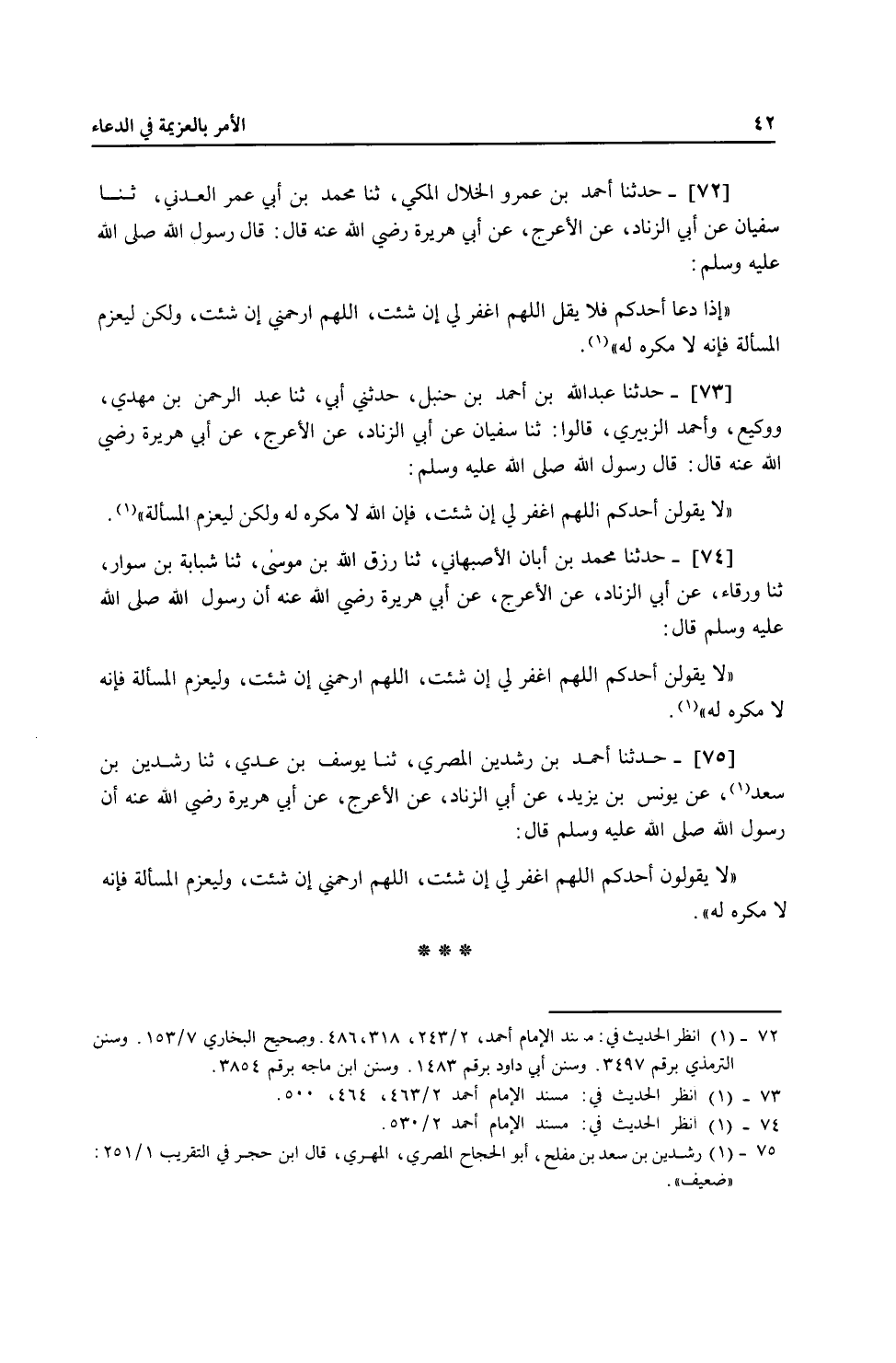 73 - حَدَّثَنَا عَبْدُ اللَّهِ بْنُ أَحْمَدَ بْنِ حَنْبَلٍ، حَدَّثَنِي أَبِي، ثنا عَبْدُ الرَّحْمَنِ بْنُ مَهْدِيٍّ، وَوَكِيعٌ، وَأَبُو أَحْمَدَ الزُّبَيْرِيُّ، قَالُوا: ثنا سُفْيَانُ، عَنْ أَبِي الزِّنَادِ، عَنِ الْأَعْرَجِ، عَنْ أَبِي هُرَيْرَةَ، رَضِيَ اللَّهُ عَنْهُ قَالَ: قَالَ رَسُولُ اللَّهِ صَلَّى اللهُ عَلَيْهِ وَسَلَّمَ: «§لَا يَقُولَنَّ أَحَدُكُمُ اللَّهُمَّ اغْفِرْ لِي إِنْ شِئْتَ فَإِنَّ اللَّهَ لَا مُكْرِهَ لَهُ وَلَكِنْ لِيَعْزِمِ الْمَسْأَلَةَ»