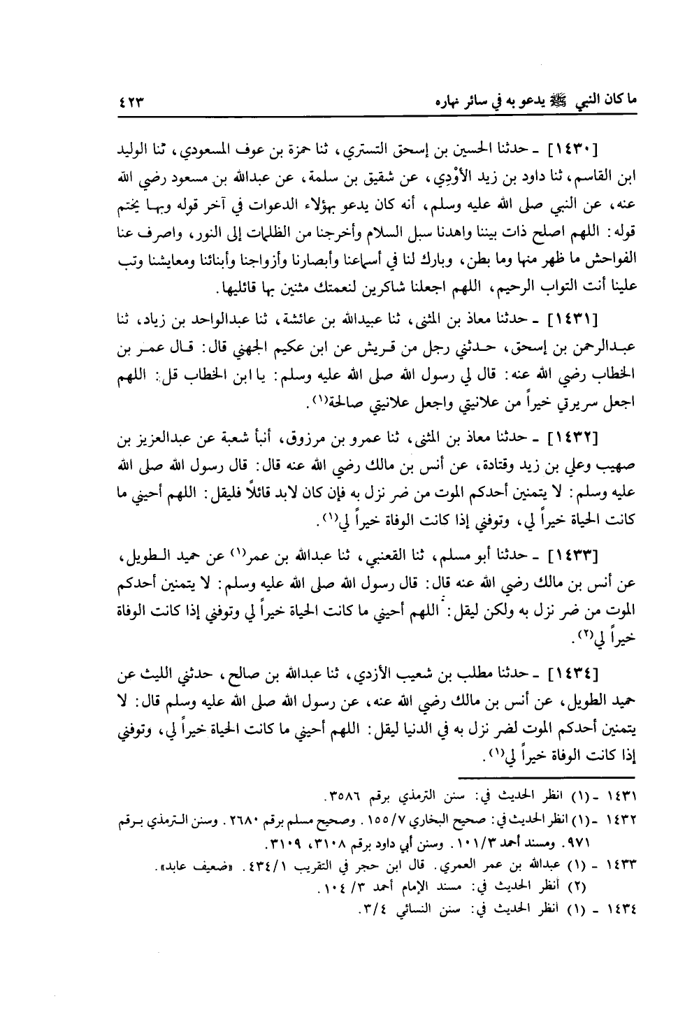 1433 - حَدَّثَنَا أَبُو مُسْلِمٍ، ثنا الْقَعْنَبِيُّ، ثنا عَبْدُ اللَّهِ بْنُ عُمَرَ، عَنْ حُمَيْدٍ الطَّوِيلِ، عَنْ أَنَسِ بْنِ مَالِكٍ، رَضِيَ اللَّهُ عَنْهُ قَالَ: قَالَ رَسُولُ اللَّهِ صَلَّى اللهُ عَلَيْهِ وَسَلَّمَ: " §لَا يَتَمَنَّيَنَّ أَحَدُكُمُ الْمَوْتَ مِنْ ضُرٍّ نَزَلَ بِهِ، وَلَكِنْ لِيَقُلِ: اللَّهُمَّ أَحْيِنِي مَا كَانَتِ الْحَيَاةُ خَيْرًا لِي، وَتَوَفَّنِي إِذَا كَانَتِ الْوَفَاةُ خَيْرًا لِي "