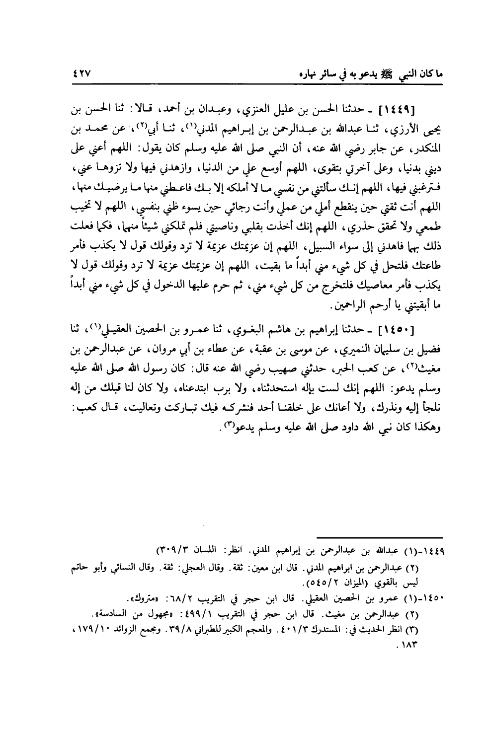 1449 - حَدَّثَنَا الْحَسَنُ بْنُ عَلِيلٍ الْعَنَزِيُّ، وَعَبْدَانُ بْنُ أَحْمَدَ، قَالَا: ثنا الْحَسَنُ بْنُ يَحْيَى الْأَرُزِّيُّ، ثنا عَبْدُ اللَّهِ بْنُ عَبْدِ الرَّحْمَنِ بْنِ إِبْرَاهِيمَ الْمَدَنِيُّ، ثنا أَبِي، عَنْ مُحَمَّدِ بْنِ الْمُنْكَدِرِ، عَنْ جَابِرٍ، رَضِيَ اللَّهُ عَنْهُ أَنَّ النَّبِيَّ صَلَّى اللهُ عَلَيْهِ وَسَلَّمَ كَانَ يَقُولُ: «§اللَّهُمَّ أَعِنِّي عَلَى دِينِي بِدُنْيَا، وَعَلَى آخِرَتِي بِتَقْوَى، اللَّهُمَّ أَوْسِعْ عَلَيَّ مِنَ الدُّنْيَا، وَأَزْهِدْنِي فِيهَا، وَلَا تَزْوِهَا عَنِّي فَتُرَغِّبَنِي فِيهَا، اللَّهُمَّ إِنَّكَ سَأَلْتَنِي مِنْ نَفْسِي مَا لَا أَمْلِكُهُ إِلَّا بِكَ، فَأَعْطِنِي مِنْهَا مَا يُرْضِيكَ مِنْهَا، اللَّهُمَّ أَنْتَ ثِقَتِي حِينَ يَنْقَطِعُ أَمَلِي مِنْ عَمَلِي، وَأَنْتَ رَجَائِي حِينَ يَسُوءُ ظَنِّي بِنَفْسِي، اللَّهُمَّ لَا تُخَيِّبْ طَمَعِي، وَلَا تَحَقُّقِ حَذَرِي، اللَّهُمَّ إِنَّكَ أَخَذْتَ بِقَلْبِي وَنَاصِيَتِي فَلَمْ تُمَلِّكْنِي شَيْئًا مِنْهُمَا، فَكَمَا فَعَلْتَ ذَلِكَ بِهِمَا فَاهْدِنِي إِلَى سَوَاءِ السَّبِيلِ، اللَّهُمَّ إِنَّ عَزِيمَتَكَ عَزِيمَةٌ لَا تُرَدُّ، وَقَوْلُكَ قَوْلٌ لَا يَكْذِبُ، فَأْمُرْ طَاعَتَكَ فَلْتَحِلَّ فِي كُلِّ شَيْءٍ مِنِّي أَبَدًا مَا بَقِيَتُ، اللَّهُمَّ إِنَّ عَزِيمَتَكَ عَزِيمَةٌ لَا تُرَدُّ، وَقَوْلُكَ قَوْلٌ لَا يَكْذِبُ، فَأْمُرْ مَعَاصِيكَ فَلْتَخْرُجْ مِنْ كُلِّ شَيْءٍ مِنِّي، ثُمَّ حَرِّمْ عَلَيْهَا الدُّخُولَ فِي كُلِّ شَيْءٍ مِنِّي أَبَدًا مَا أَبْقَيْتَنِي يَا أَرْحَمَ الرَّاحِمِينَ»