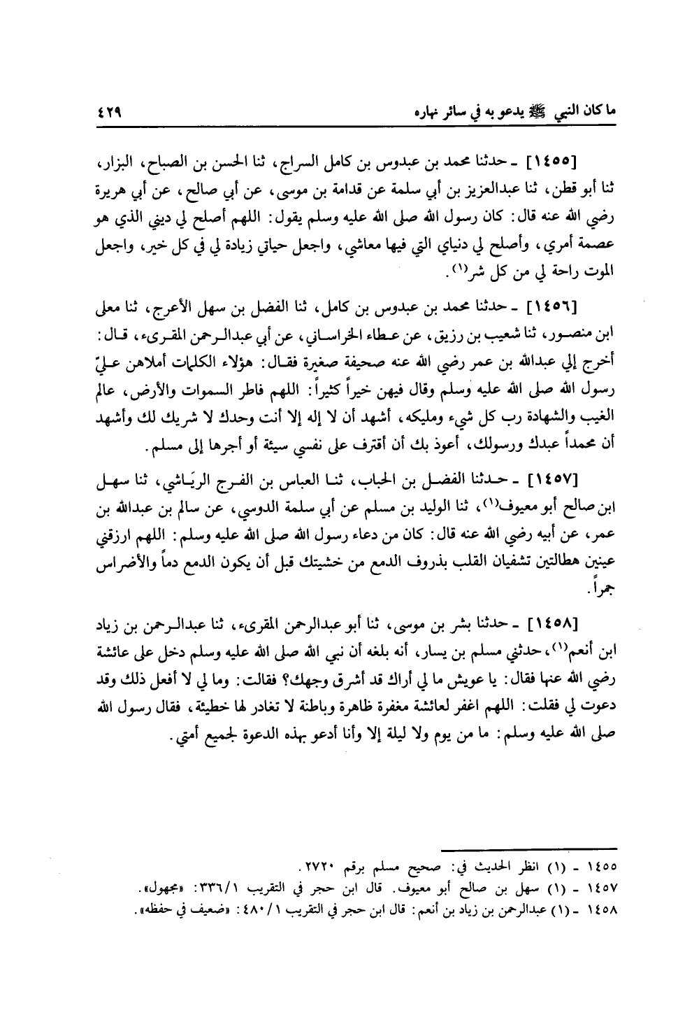 1455 - حَدَّثَنَا مُحَمَّدُ بْنُ عَبْدوسِ بْنِ كَامِلٍ السَّرَّاجُ، ثنا الْحَسَنُ بْنُ الصَّبَّاحِ الْبَزَّارُ، ثنا أَبُو قَطَنٍ، ثنا عَبْدُ الْعَزِيزِ بْنُ أَبِي سَلَمَةَ، عَنْ قُدَامَةَ بْنِ مُوسَى، عَنْ أَبِي صَالِحٍ، عَنْ أَبِي هُرَيْرَةَ، رَضِيَ اللَّهُ عَنْهُ قَالَ: كَانَ رَسُولُ اللَّهِ صَلَّى اللهُ عَلَيْهِ وَسَلَّمَ يَقُولُ: «§اللَّهُمَّ أَصْلِحْ لِي دِينِي الَّذِي هُوَ عِصْمَةُ أَمْرِي، وَأَصْلِحْ لِي دُنْيَايَ الَّتِي فِيهَا مَعَاشِي، وَاجْعَلْ حَيَاتِي زِيَادَةً لِي فِي كُلِّ خَيْرٍ، وَاجْعَلِ الْمَوْتَ رَاحَةً لِي مِنْ كُلِّ شَرٍّ»