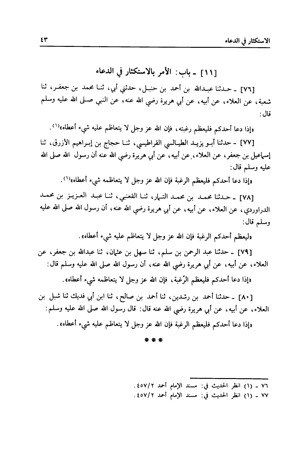 76 - حَدَّثَنَا عَبْدُ اللَّهِ بْنُ أَحْمَدَ بْنِ حَنْبَلٍ، حَدَّثَنِي أَبِي، ثنا مُحَمَّدُ بْنُ جَعْفَرٍ، ثنا شُعْبَةُ، عَنِ الْعَلَاءِ، عَنْ أَبِيهِ، عَنْ أَبِي هُرَيْرَةَ، رَضِيَ اللَّهُ عَنْهُ عَنِ النَّبِيِّ صَلَّى اللهُ عَلَيْهِ وَسَلَّمَ قَالَ: «§إِذَا دَعَا أَحَدُكُمْ فَلْيُعَظِّمْ رَغْبَتَهُ فَإِنَّ اللَّهَ عَزَّ وَجَلَّ لَا يَتَعَاظَمُ عَلَيْهِ شَيْءٌ أَعْطَاهُ»