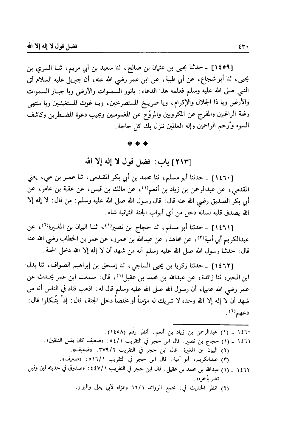 1462 - حَدَّثَنَا زَكَرِيَّا بْنُ يَحْيَى السَّاجِيُّ، ثنا إِسْحَاقُ بْنُ إِبْرَاهِيمَ الصَّوَّافُ، ثنا بَدَّلُ بْنُ الْمُحَبَّرِ، ثنا زَائِدَةُ، عَنْ عَبْدِ اللَّهِ بْنِ مُحَمَّدِ بْنِ عَقِيلٍ، قَالَ: سَمِعْتُ ابْنَ عُمَرَ، يُحَدِّثُ عَنْ عُمَرَ، رَضِيَ اللَّهُ عَنْهُمَا أَنَّ رَسُولَ اللَّهِ صَلَّى اللهُ عَلَيْهِ وَسَلَّمَ قَالَ لَهُ: «§اذْهَبْ فَنَادِ فِي النَّاسِ أَنَّهُ مَنْ شَهِدَ أَنْ لَا إِلَهَ إِلَّا اللَّهُ وَحْدَهُ لَا شَرِيكَ لَهُ مُؤْمِنًا أَوْ مُخْلِصًا دَخَلَ الْجَنَّةَ» قَالَ: إِذًا يَتَّكِلُوا، قَالَ: «دَعْهُمْ»