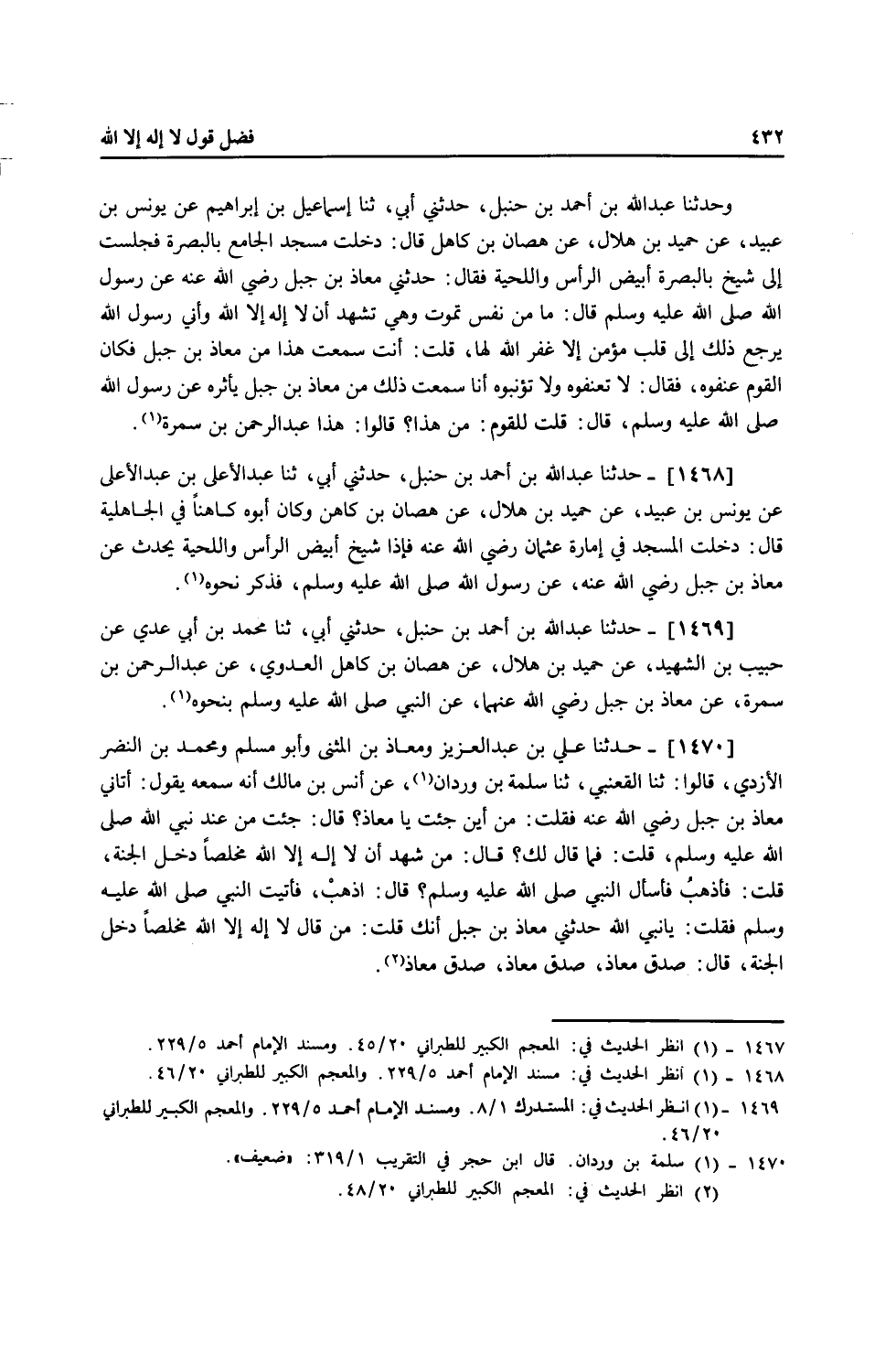 1470 - حَدَّثَنَا عَلِيُّ بْنُ عَبْدِ الْعَزِيزِ، وَمُعَاذُ بْنُ الْمُثَنَّى، وَأَبُو مُسْلِمٍ وَمُحَمَّدُ بْنُ النَّضْرِ الْأَزْدِيُّ قَالُوا: ثنا الْقَعْنَبِيُّ، ثنا سَلَمَةُ بْنُ وَرْدَانَ، عَنْ أَنَسِ بْنِ مَالِكٍ، أَنَّهُ سَمِعَهُ يَقُولُ: أَتَانِي مُعَاذُ بْنُ جَبَلٍ رَضِيَ اللَّهُ عَنْهُ فَقُلْتُ: مِنْ أَيْنَ جِئْتَ يَا مُعَاذُ؟ قَالَ: جِئْتُ مِنْ عِنْدِ نَبِيِّ اللَّهِ صَلَّى اللهُ عَلَيْهِ وَسَلَّمَ، قُلْتُ: فَمَا قَالَ لَكَ؟ قَالَ: «§مَنْ شَهِدَ أَنْ لَا إِلَهَ إِلَّا اللَّهُ مُخْلِصًا دَخَلَ الْجَنَّةَ» قُلْتُ: فَأَذْهَبُ فَأَسْأَلُ النَّبِيَّ صَلَّى اللهُ عَلَيْهِ وَسَلَّمَ قَالَ: اذْهَبْ، فَأَتَيْتُ النَّبِيَّ صَلَّى اللهُ عَلَيْهِ وَسَلَّمَ فَقُلْتُ: يَا نَبِيَّ اللَّهِ حَدَّثَنِي مُعَاذُ بْنُ جَبَلٍ أَنَّكَ قُلْتَ: «مَنْ قَالَ لَا إِلَهَ إِلَّا اللَّهُ مُخْلِصًا دَخَلَ الْجَنَّةَ» قَالَ: «صَدَقَ مُعَاذٌ، صَدَقَ مُعَاذٌ، صَدَقَ مُعَاذٌ»