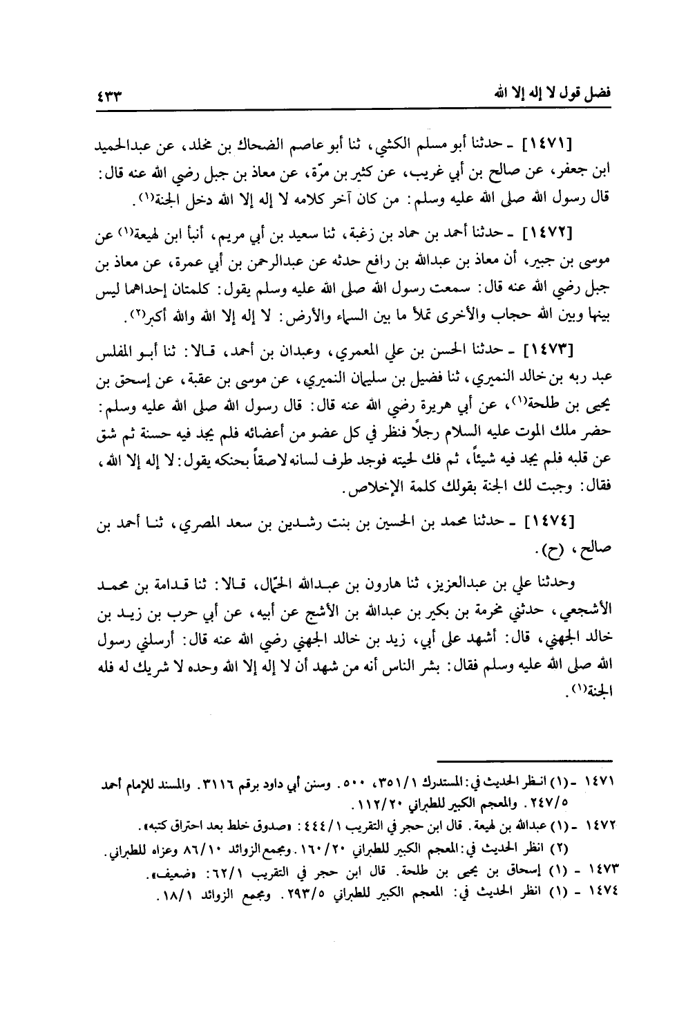 1471 - حَدَّثَنَا أَبُو مُسْلِمٍ الْكَشِّيُّ، ثنا أَبُو عَاصِمٍ الضَّحَّاكُ بْنُ مَخْلَدٍ، عَنْ عَبْدِ الْحَمِيدِ بْنِ جَعْفَرٍ، عَنْ صَالِحِ بْنِ أَبِي عَرِيبٍ، عَنْ كَثِيرِ بْنِ مُرَّةَ، عَنْ مُعَاذِ بْنِ جَبَلٍ، رَضِيَ اللَّهُ عَنْهُ قَالَ: قَالَ رَسُولُ اللَّهِ صَلَّى اللهُ عَلَيْهِ وَسَلَّمَ: «§مَنْ كَانَ آخِرُ كَلَامِهِ لَا إِلَهَ إِلَّا اللَّهُ دَخَلَ الْجَنَّةَ»
