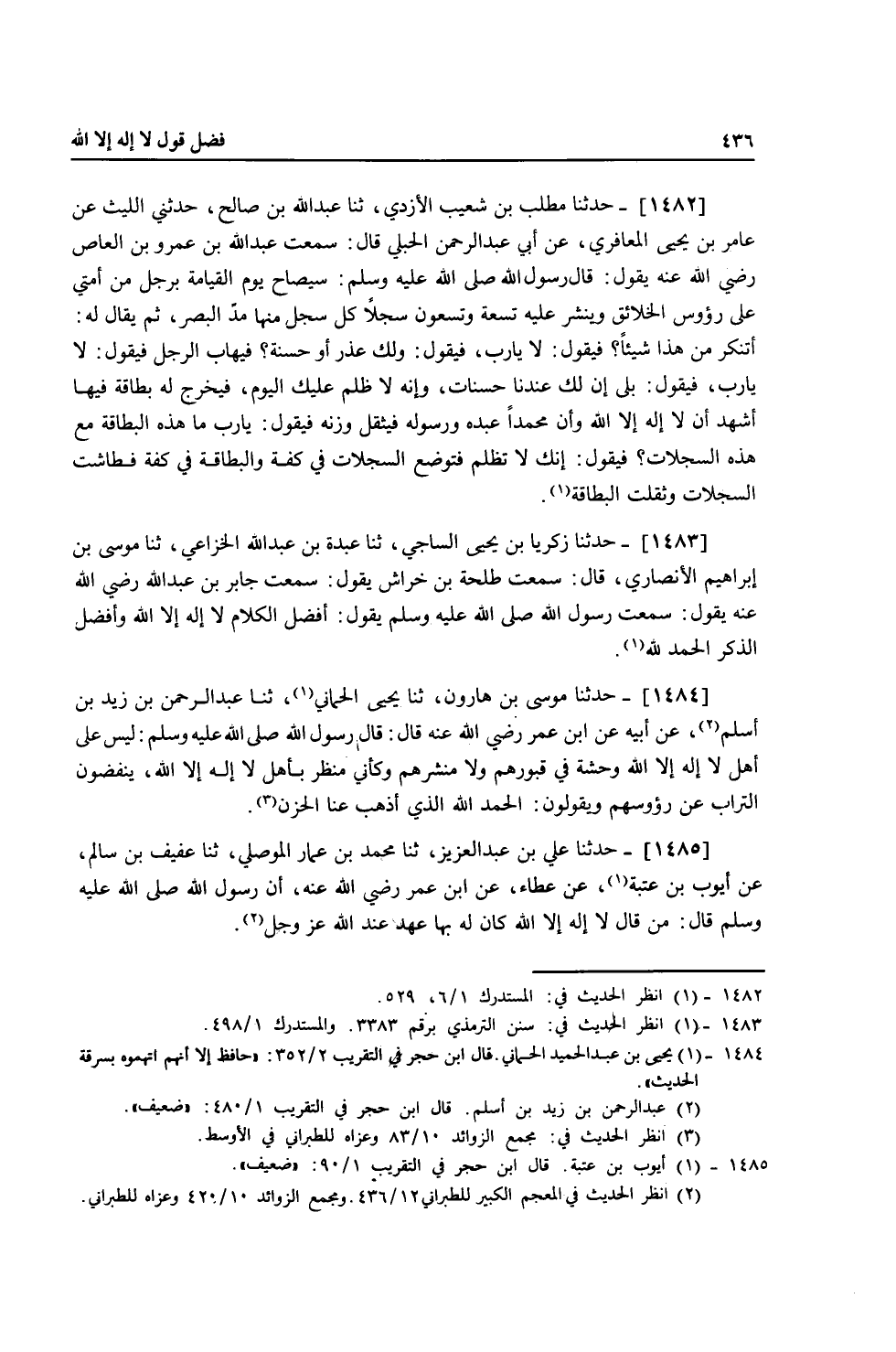 1482 - حَدَّثَنَا مُطَّلِبُ بْنُ شُعَيْبٍ الْأَزْدِيُّ، ثنا عَبْدُ اللَّهِ بْنُ صَالِحٍ، حَدَّثَنِي اللَّيْثُ، عَنْ عَامِرِ بْنِ يَحْيَى الْمَعَافِرِيِّ، عَنْ أَبِي عَبْدِ الرَّحْمِنِ الْحُبُلِيِّ، قَالَ: سَمِعْتُ عَبْدَ اللَّهِ بْنَ عَمْرِو بْنِ الْعَاصِ، رَضِيَ اللَّهُ عَنْهُ يَقُولُ: قَالَ رَسُولُ اللَّهِ صَلَّى اللهُ عَلَيْهِ وَسَلَّمَ: " سَيُصَاحُ يَوْمَ الْقِيَامَةِ بِرَجُلٍ مِنْ أُمَّتِي عَلَى رُءُوسِ الْخَلَائِقِ ويُنْشَرُ عَلَيْهِ تِسْعَةٌ وَتِسْعُونَ سِجِلًّا كُلِّ سِجِلٍّ مِنْهَا مَدُّ الْبَصَرِ، ثُمَّ يُقَالُ لَهُ: أَتُنْكِرُ مِنْ هَذَا شَيْئًا؟ فَيَقُولُ: لَا يَا رَبِّ، فَيَقُولُ: وَلَكَ عُذْرٌ أَوْ حَسَنَةٌ فُيَهَابُ الرَّجُلُ، فَيَقُولُ: لَا يَا رَبِّ، فَيَقُولُ: بَلَى إِنَّ لَكَ عِنْدَنَا حَسَنَاتٍ وَإِنَّهُ §لَا ظُلْمَ عَلَيْكَ الْيَوْمَ فَيُخْرَجُ لَهُ بِطَاقَةٌ فِيهَا أَشْهَدُ أَنْ لَا إِلَهَ إِلَّا اللَّهُ وَأَنَّ مُحَمَّدًا عَبْدُهُ وَرَسُولُهُ فَيَثْقُلُ وَزْنُهُ فَيَقُولُ: يَا رَبِّ مَا هَذِهِ الْبِطَاقَةُ مَعَ هَذِهِ السِّجِلَّاتِ؟ فَيَقُولُ: إِنَّكَ لَا تُظْلَمُ فَتُوضَعُ السِّجِلَّاتُ فِي كِفَّةٍ وَالْبِطَاقَةُ فِي كِفَّةٍ فَطَاشَتِ السِّجِلَّاتُ وَثَقُلَتِ الْبِطَاقَةُ "