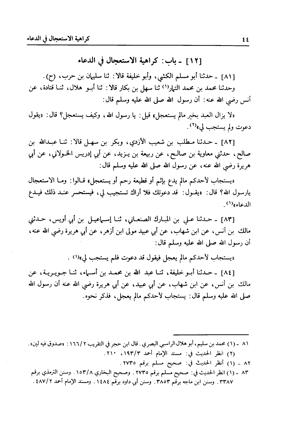81 - حَدَّثَنَا أَبُو مُسْلِمٍ الْكَشِّيُّ، وَأَبُو خَلِيفَةَ قَالَا: ثنا سُلَيْمَانُ بْنُ حَرْبٍ، ح وَحَدَّثَنَا مُحَمَّدُ بْنُ مُحَمَّدِ التَّمَّارُ، ثنا سَهْلُ بْنُ بَكَّارٍ، قَالَا: ثنا أَبُو هِلَالٍ، ثنا قَتَادَةُ، عَنْ أَنَسٍ، رَضِيَ اللَّهُ عَنْهُ أَنَّ رَسُولَ اللَّهِ صَلَّى اللهُ عَلَيْهِ وَسَلَّمَ قَالَ: «§لَا يَزَالُ الْعَبْدُ بِخَيْرٍ مَا لَمْ يَسْتَعْجِلْ» قِيلَ: يَا رَسُولَ اللَّهِ، وَكَيْفَ يَسْتَعْجِلُ؟ قَالَ: «يَقُولُ دَعَوْتُ وَلَمْ يُسْتَجَبْ لِي»