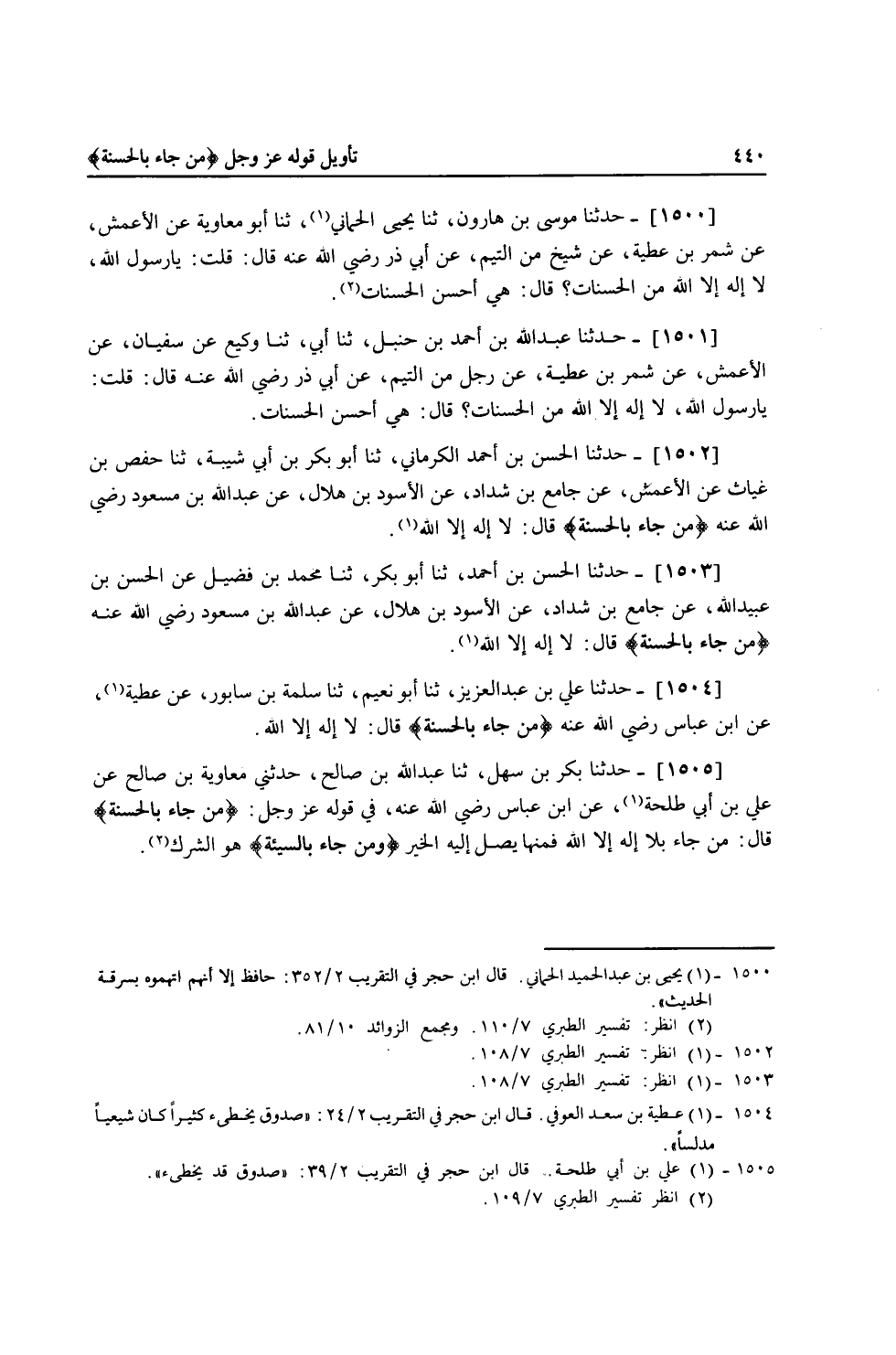 1504 - حَدَّثَنَا عَلِيُّ بْنُ عَبْدِ الْعَزِيزِ، ثنا أَبُو نُعَيْمٍ، ثنا سَلَمَةُ بْنُ سَابُورَ، عَنْ عَطِيَّةَ، عَنِ ابْنِ عَبَّاسٍ، رَضِيَ اللَّهُ عَنْهُ {§مَنْ جَاءَ بِالْحَسَنَةِ} [الأنعام: 160] قَالَ: «لَا إِلَهَ إِلَّا اللَّهُ»