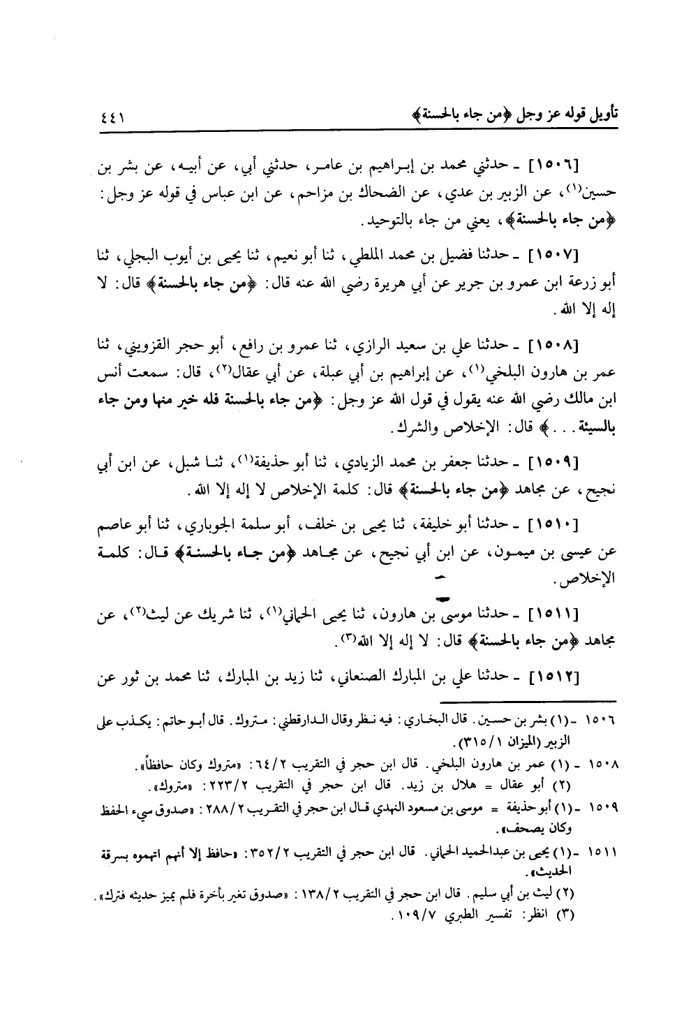 1506 - حَدَّثَنِي مُحَمَّدُ بْنُ إِبْرَاهِيمَ بْنِ عَامِرٍ، حَدَّثَنِي أَبِي، عَنْ أَبِيهِ، عَنْ بِشْرِ بْنِ حُسَيْنٍ، عَنِ الزُّبَيْرِ بْنِ عَدِيٍّ، عَنِ الضَّحَّاكِ بْنِ مُزَاحِمٍ، عَنِ ابْنِ عَبَّاسٍ، فِي قَوْلِهِ عَزَّ وَجَلَّ {§مَنْ جَاءَ بِالْحَسَنَةِ} [الأنعام: 160] «يَعْنِي مِنْ جَاءَ بِالتَّوْحِيدِ»