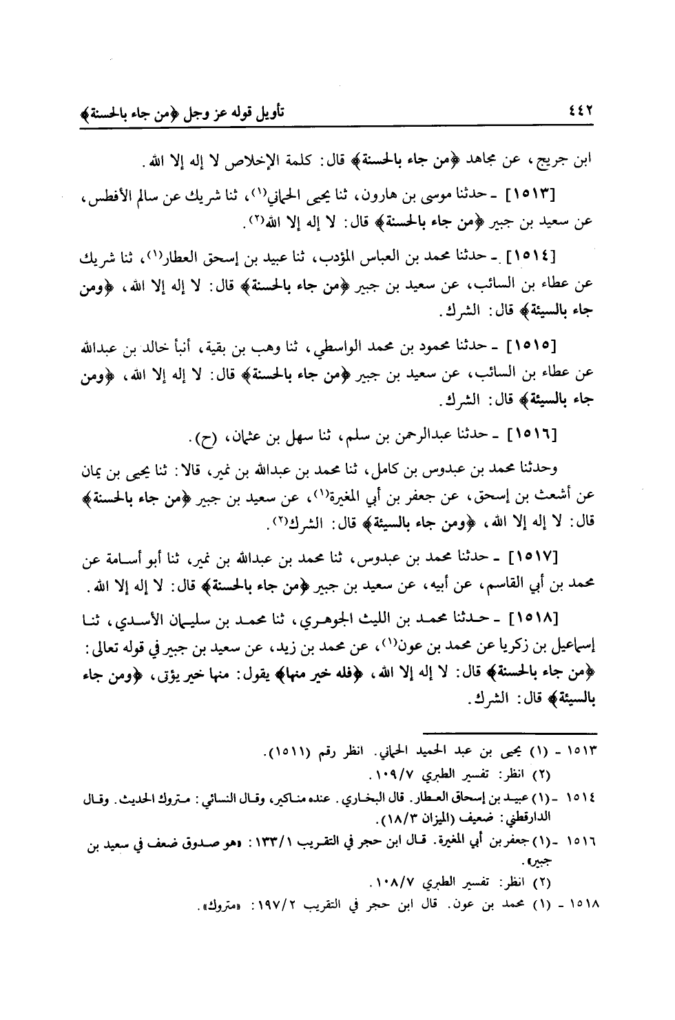 1516 - حَدَّثَنَا عَبْدُ الرَّحْمَنِ بْنُ سَلْمٍ، ثنا سَهْلُ بْنُ عُثْمَانَ، ح وَحَدَّثَنَا مُحَمَّدُ بْنُ عَبْدوسِ بْنِ كَامِلٍ، ثنا مُحَمَّدُ بْنُ عَبْدِ اللَّهِ بْنِ نُمَيْرٍ، قَالَا: ثنا يَحْيَى بْنُ يَمَانٍ، عَنْ أَشْعَثَ بْنِ إِسْحَاقَ، عَنْ جَعْفَرِ بْنِ أَبِي الْمُغِيرَةِ، عَنْ سَعِيدِ بْنِ جُبَيْرٍ، {§مَنْ جَاءَ بِالْحَسَنَةِ} [الأنعام: 160] قَالَ: " لَا إِلَهَ إِلَّا اللَّهُ {وَمَنْ جَاءَ بِالسَّيِّئَةِ} [الأنعام: 160] قَالَ: الشِّرْكُ "