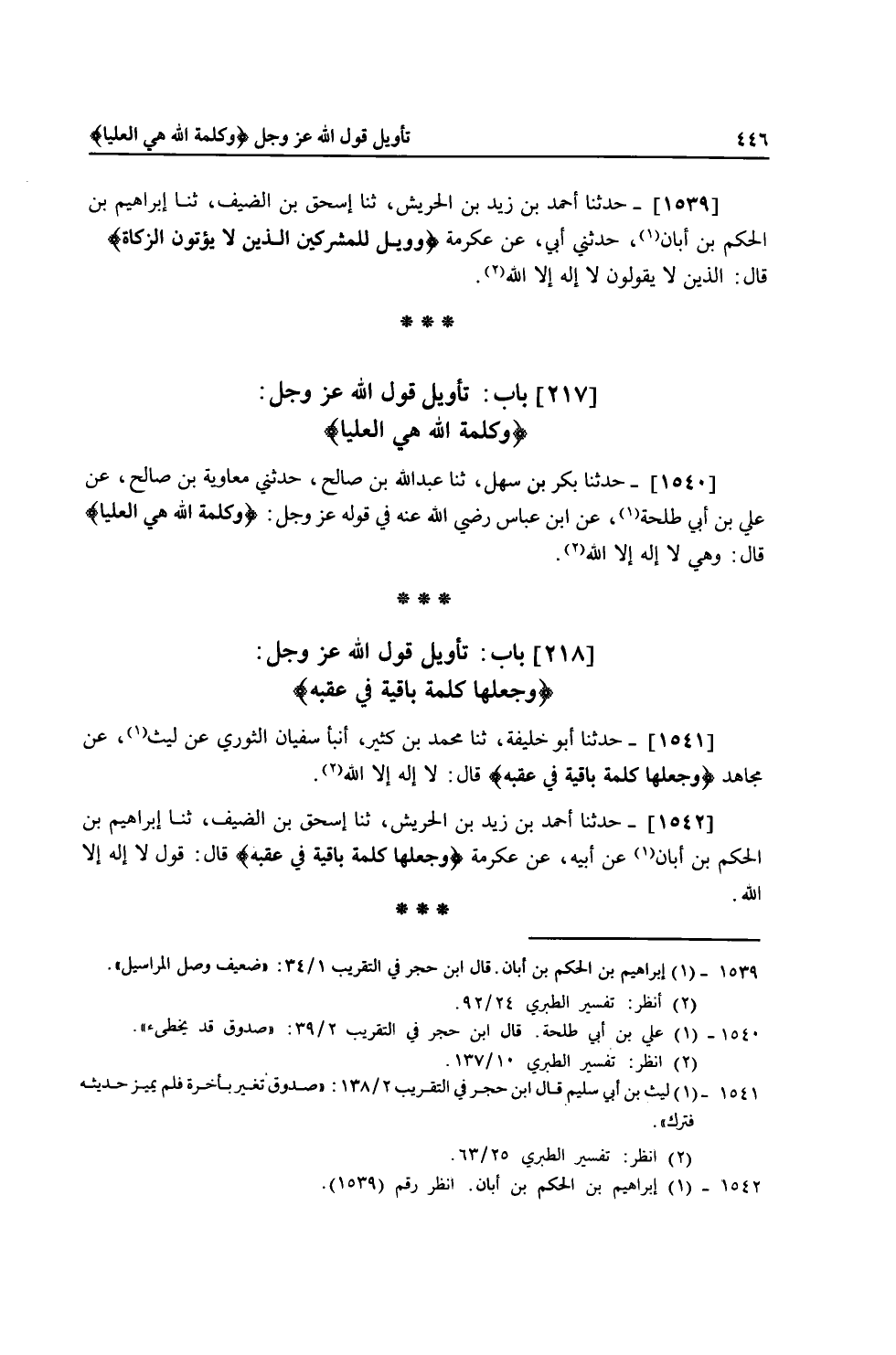 1542 - حَدَّثَنَا أَحْمَدُ بْنُ زَيْدِ بْنِ الْحَرِيشِ، ثنا إِسْحَاقُ بْنُ الضَّيْفِ، ثنا إِبْرَاهِيمُ بْنُ الْحَكَمِ بْنِ أَبَانَ، عَنْ أَبِيهِ، عَنْ عِكْرِمَةَ، {§وَجَعَلَهَا كَلِمَةً بَاقِيَةَ فِي عَقِبِهِ} [الزخرف: 28] قَالَ: «قَوْلُ لَا إِلَهَ إِلَّا اللَّهُ»