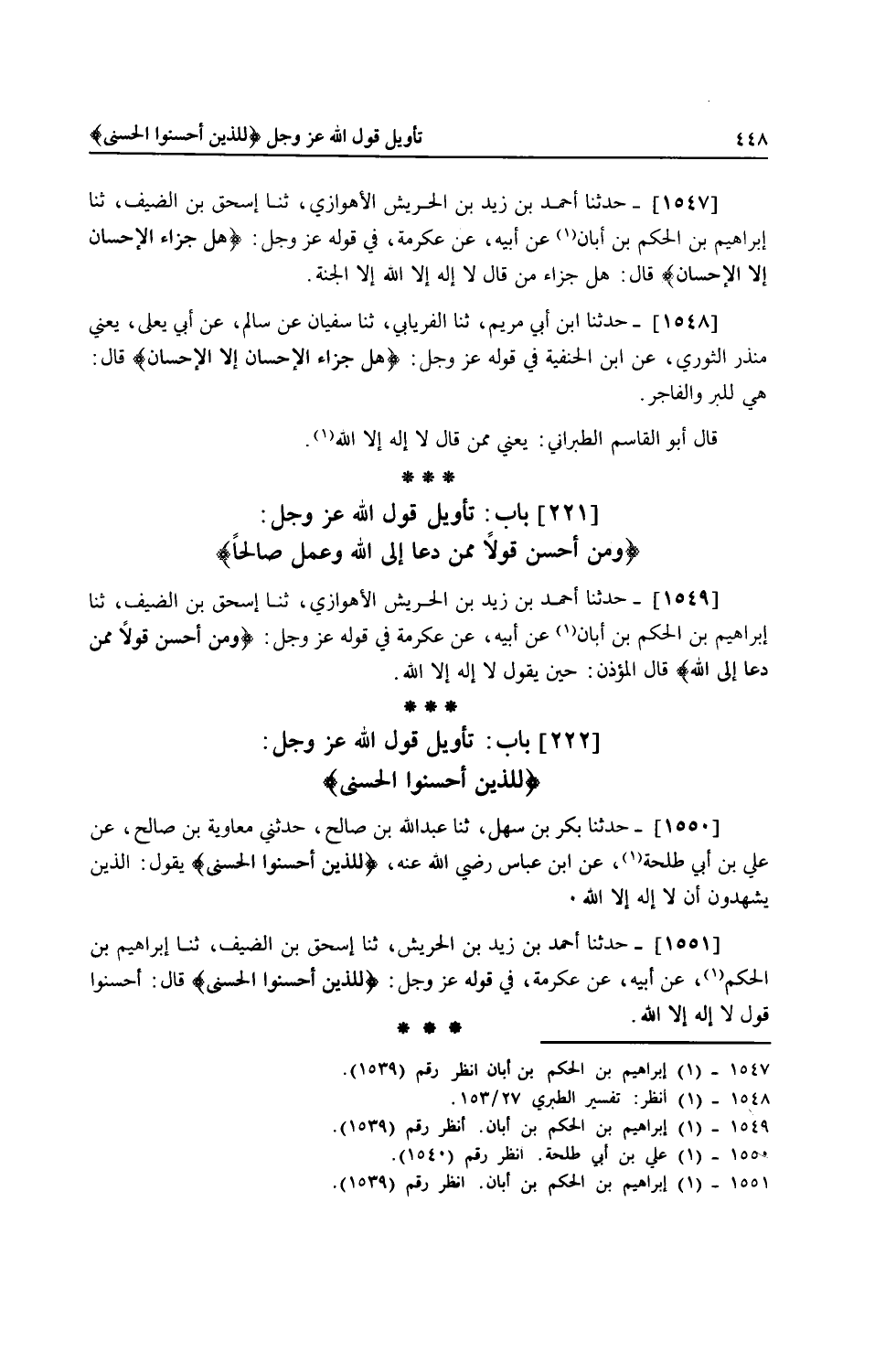 1547 - حَدَّثَنَا أَحْمَدُ بْنُ زَيْدِ بْنِ الْحَرِيشِ الْأَهْوَازِيُّ، ثنا إِسْحَاقُ بْنُ الضَّيْفِ، ثنا إِبْرَاهِيمُ بْنُ الْحَكَمِ بْنِ أَبَانَ، عَنْ أَبِيهِ، عَنْ عِكْرِمَةَ، فِي قَوْلِهِ عَزَّ وَجَلَّ {§هَلْ جَزَاءُ الْإِحْسَانِ إِلَّا الْإِحْسَانُ} [الرحمن: 60] قَالَ: " هَلْ جَزَاءُ مَنْ قَالَ: لَا إِلَهَ إِلَّا اللَّهُ إِلَّا الْجَنَّةُ "