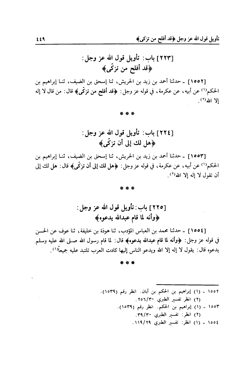 1553 - حَدَّثَنَا أَحْمَدُ بْنُ زَيْدِ بْنِ الْحَرِيشِ، ثنا إِسْحَاقُ بْنُ الضَّيْفِ، ثنا إِبْرَاهِيمُ بْنُ الْحَكَمِ، عَنْ أَبِيهِ، عَنْ عِكْرِمَةَ، فِي قَوْلِهِ عَزَّ وَجَلَّ {§هَلْ لَكَ إِلَى أَنْ تَزَكَّى} [النازعات: 18] قَالَ: «هَلْ لَكَ إِلَى أَنْ تَقُولَ لَا إِلَهَ إِلَّا اللَّهُ»