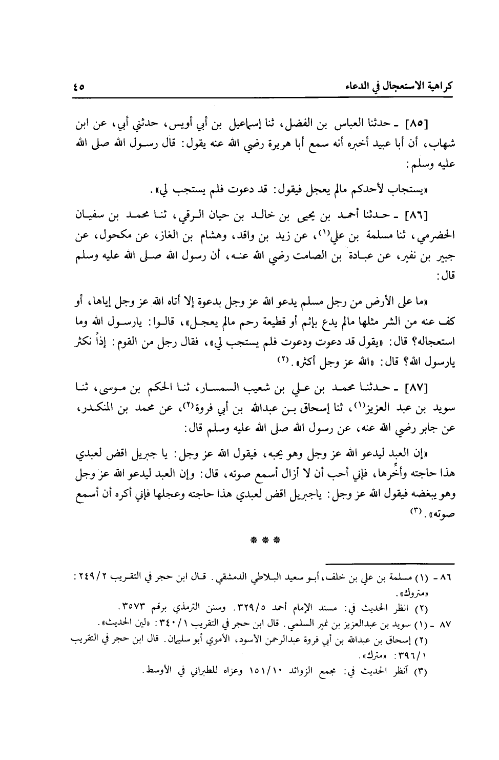 85 - حَدَّثَنَا الْعَبَّاسُ بْنُ الْفَضْلِ، ثنا إِسْمَاعِيلُ بْنُ أَبِي أُوَيْسٍ، حَدَّثَنِي أَبِي، عَنِ ابْنِ شِهَابٍ، أَنَّ أَبَا عُبَيْدٍ أَخْبَرَهُ أَنَّهُ سَمِعَ أَبَا هُرَيْرَةَ، رَضِيَ اللَّهُ عَنْهُ يَقُولُ: قَالَ رَسُولُ اللَّهِ صَلَّى اللهُ عَلَيْهِ وَسَلَّمَ: «§يُسْتَجَابُ لِأَحَدِكُمْ مَا لَمْ يَعْجَلْ فَيَقُولُ قَدْ دَعَوْتُ فَلَمْ يُسْتَجَبْ لِي»