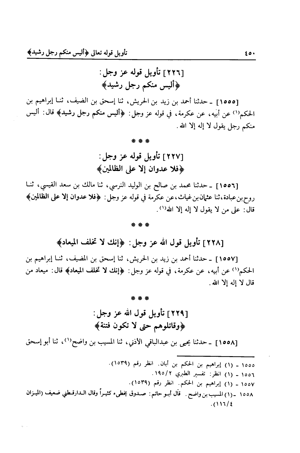 1555 - حَدَّثَنَا أَحْمَدُ بْنُ زَيْدِ بْنِ الْحَرِيشِ، ثنا إِسْحَاقُ بْنُ الضَّيْفِ، ثنا إِبْرَاهِيمُ بْنُ الْحَكَمِ، عَنْ أَبِيهِ، عَنْ عِكْرِمَةَ، فِي قَوْلِهِ عَزَّ وَجَلَّ {§أَلَيْسَ مِنْكُمْ رَجُلٌ رَشِيدٌ} [هود: 78] قَالَ: " أَلَيْسَ مِنْكُمْ رَجُلٌ يَقُولُ: لَا إِلَهَ إِلَّا اللَّهُ "