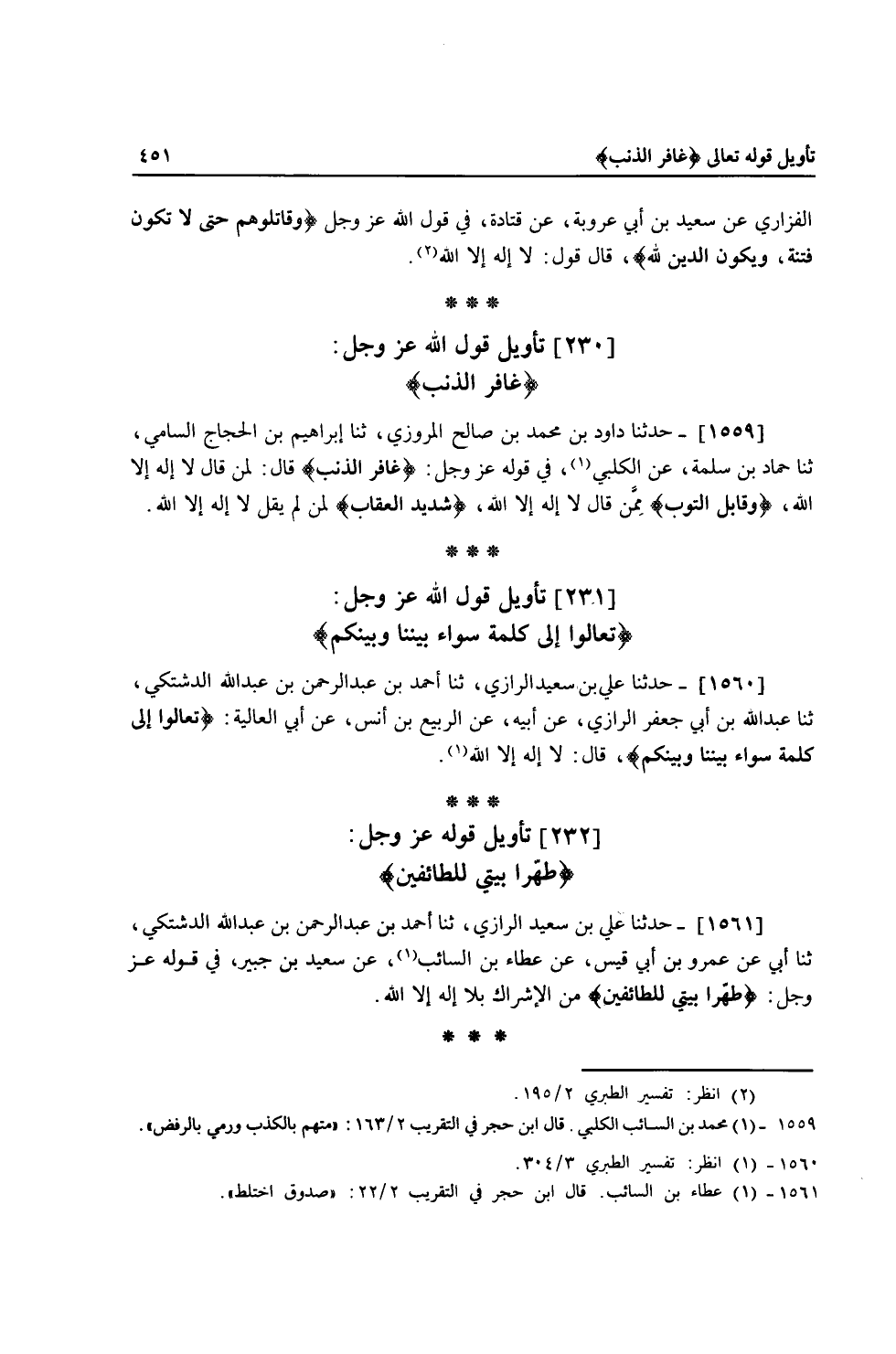 1559 - حَدَّثَنَا دَاوُدُ بْنُ مُحَمَّدِ بْنِ صَالِحٍ الْمَرْوَزِيُّ، ثنا إِبْرَاهِيمُ بْنُ الْحَجَّاجِ السَّامِيُّ، ثنا حَمَّادُ بْنُ سَلَمَةَ، عَنِ الْكَلْبِيِّ، فِي قَوْلِهِ عَزَّ وَجَلَّ {§غَافِرِ الذَّنْبِ} [غافر: 3] قَالَ: " لِمَنْ قَالَ: لَا إِلَهَ إِلَّا اللَّهُ {وَقَابِلِ التَّوْبِ} [غافر: 3] مِمَنْ قَالَ: لَا إِلَهَ إِلَّا اللَّهُ {شَدِيدِ الْعِقَابِ} [البقرة: 196] لِمَنْ لَمْ يَقُلْ: لَا إِلَهَ إِلَّا اللَّهُ "