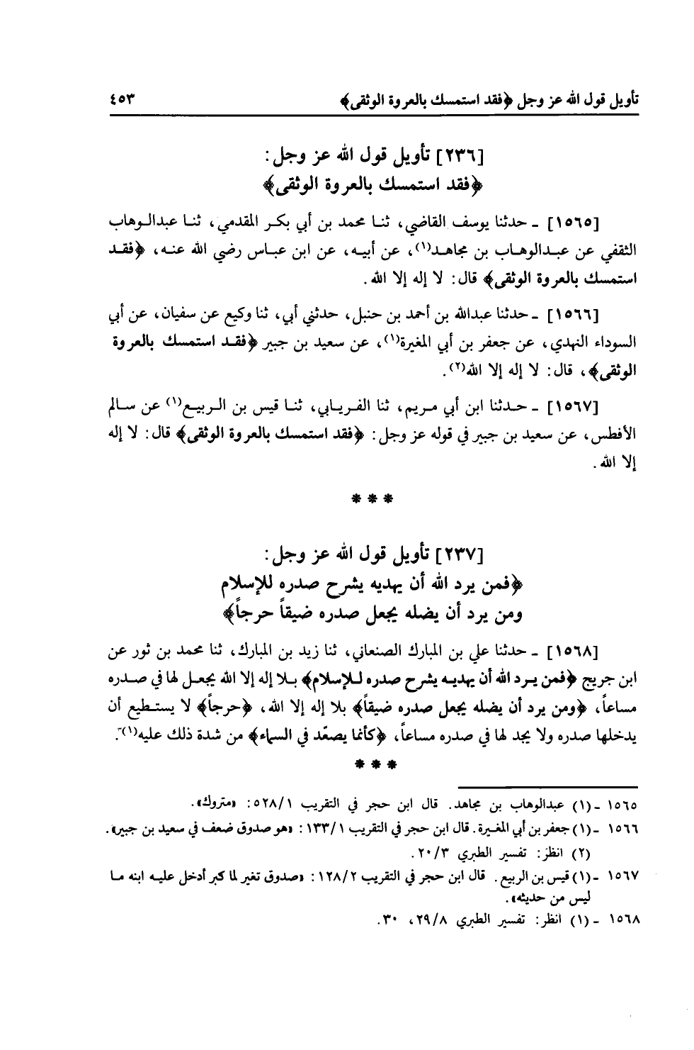 1567 - حَدَّثَنَا ابْنُ أَبِي مَرْيَمَ، ثنا الْفِرْيَابِيُّ، ثنا قَيْسُ بْنُ الرَّبِيعِ، عَنْ سَالِمٍ الْأَفْطَسِ، عَنْ سَعِيدِ بْنِ جُبَيْرٍ، فِي قَوْلِهِ عَزَّ وَجَلَّ {§فَقَدِ اسْتَمْسَكَ بِالْعُرْوَةِ الْوثْقَى} [البقرة: 256] قَالَ: «لَا إِلَهَ إِلَّا اللَّهُ»