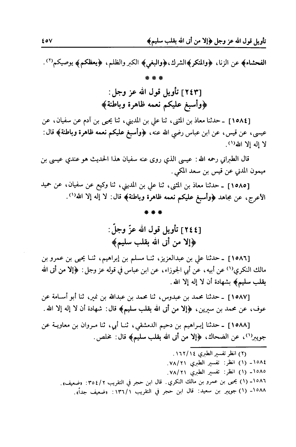 1588 - حَدَّثَنَا إِبْرَاهِيمُ بْنُ دُحَيْمٍ الدِّمَشْقِيُّ، ثنا أَبِي، ثنا مَرْوَانُ بْنُ مُعَاوِيَةَ، عَنْ جُوَيْبِرٍ، عَنِ الضَّحَّاكِ، {§إِلَّا مَنْ أَتَى اللَّهَ بِقَلْبٍ سَلِيمٍ} [الشعراء: 89] قَالَ: «مُخْلِصٍ»