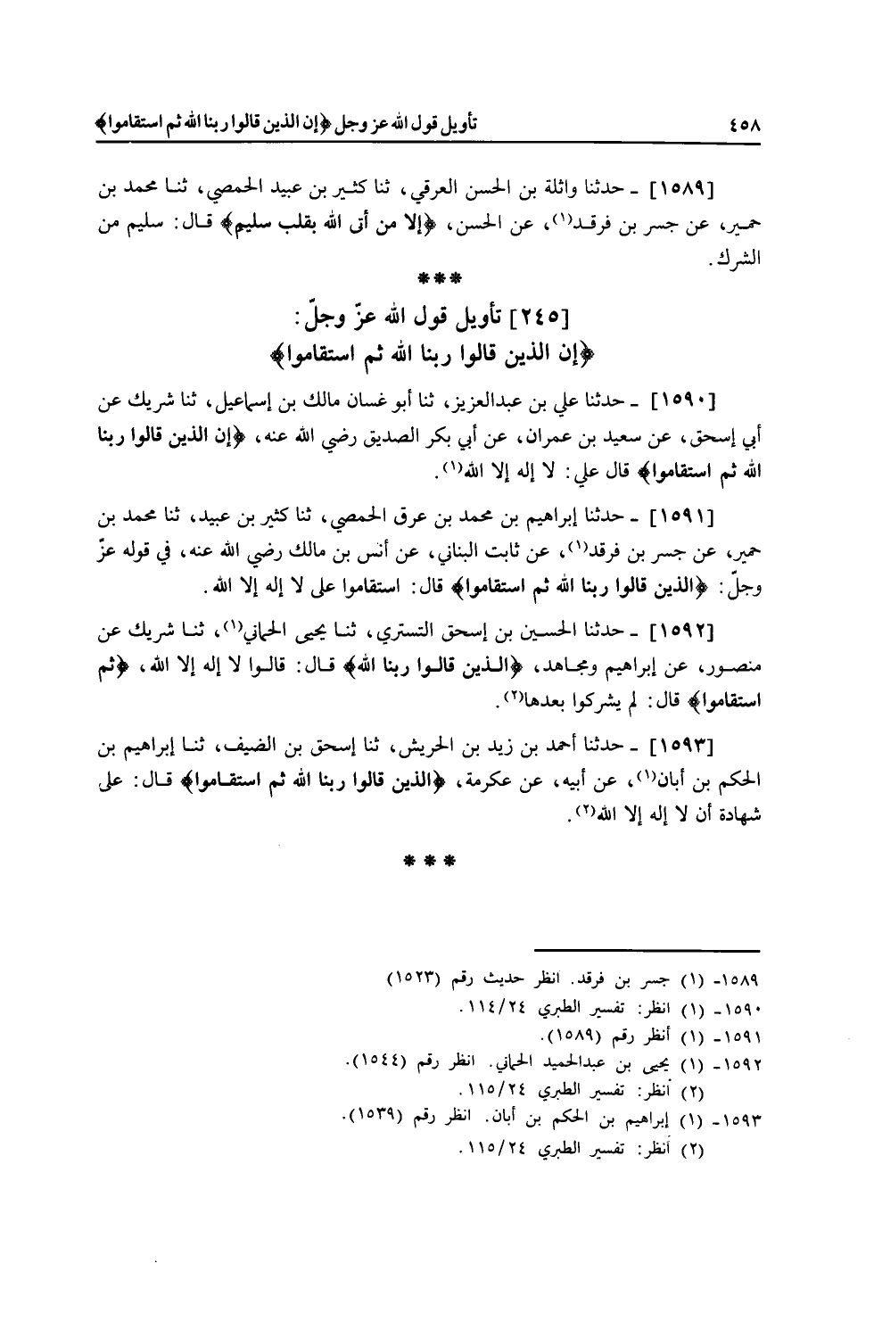 1592 - حَدَّثَنَا الْحُسَيْنُ بْنُ إِسْحَاقَ التُّسْتَرِيُّ، ثنا يَحْيَى الْحِمَّانِيُّ، ثنا شَرِيكٌ، عَنْ مَنْصُورٍ، عَنْ إِبْرَاهِيمَ، وَمُجَاهِدٍ، {§الَّذِينَ قَالُوا رَبُّنَا اللَّهُ} [فصلت: 30] قَالَ: " قَالُوا: لَا إِلَهَ إِلَّا اللَّهُ {ثُمَّ اسْتَقَامُوا} [فصلت: 30] قَالَ: لَمْ يُشْرِكُوا بَعْدَهَا "
