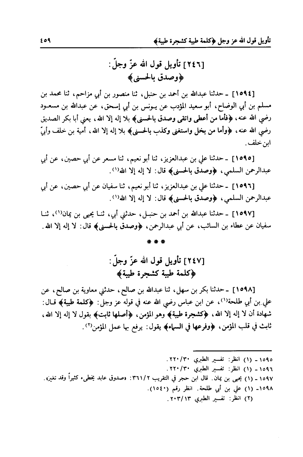 1595 - حَدَّثَنَا عَلِيُّ بْنُ عَبْدِ الْعَزِيزِ، ثنا أَبُو نُعَيْمٍ، ثنا مِسْعَرٌ، عَنْ أَبِي حُصَينٍ، عَنْ أَبِي عَبْدِ الرَّحْمَنِ السُّلَمِيِّ، {§وَصَدَّقَ بِالْحُسْنَى} [الليل: 6] قَالَ: «لَا إِلَهَ إِلَّا اللَّهُ»