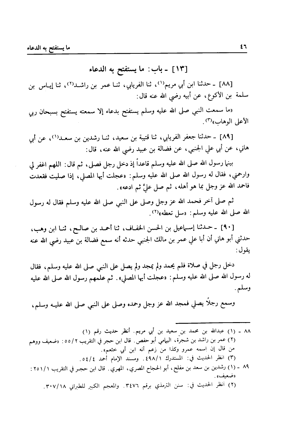 89 - حَدَّثَنَا جَعْفَرٌ الْفِرْيَابِيُّ، ثنا قُتَيْبَةُ بْنُ سَعِيدٍ، ثنا رِشْدِينُ بْنُ سَعْدٍ، عَنْ أَبِي هَانِئٍ، عَنْ أَبِي عَلِيٍّ الْجَنْبِيِّ، عَنْ فَضَالَةَ بْنِ عُبَيْدٍ، رَضِيَ اللَّهُ عَنْهُ قَالَ: بَيْنَمَا رَسُولُ اللَّهِ صَلَّى اللهُ عَلَيْهِ وَسَلَّمَ قَاعِدًا إِذْ دَخَلَ رَجُلٌ فَصَلَّى، ثُمَّ قَالَ: اللَّهُمَّ اغْفِرْ لِي وَارْحَمْنِي، فَقَالَ لَهُ رَسُولُ اللَّهِ صَلَّى اللهُ عَلَيْهِ وَسَلَّمَ: «§عَجِلْتَ أَيُّهَا الْمُصَلِّي، إِذَا صَلَّيْتَ فَقَعَدْتَ فَاحْمَدِ اللَّهَ عَزَّ وَجَلَّ بِمَا هُوَ أَهْلُهُ، ثُمَّ صَلِّ عَلَيَّ، ثُمَّ ادْعُهُ» ، ثُمَّ صَلَّى آخَرُ فَحَمِدَ اللَّهَ عَزَّ وَجَلَّ وَصَلَّى عَلَى النَّبِيِّ صَلَّى اللهُ عَلَيْهِ وَسَلَّمَ فَقَالَ لَهُ رَسُولُ اللَّهِ صَلَّى اللهُ عَلَيْهِ وَسَلَّمَ: «سَلْ تُعْطَهْ»