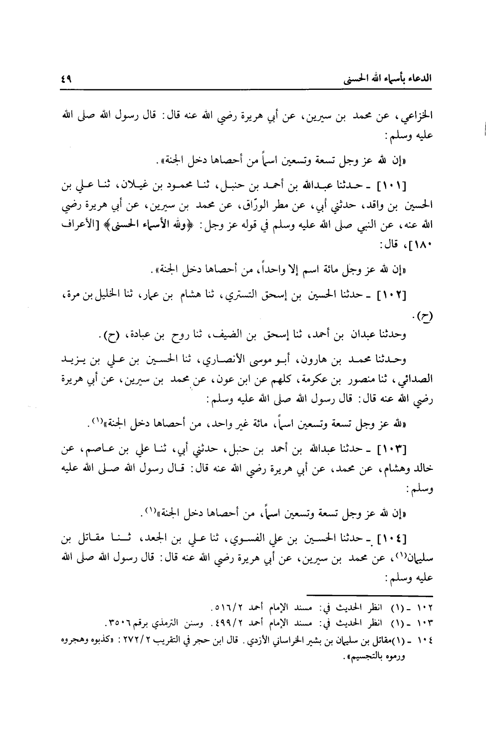 103 - حَدَّثَنَا عَبْدُ اللَّهِ بْنُ أَحْمَدَ بْنِ حَنْبَلٍ، حَدَّثَنِي أَبِي، ثنا عَلِيُّ بْنُ عَاصِمٍ، عَنْ خَالِدٍ، وَهِشَامٍ، عَنْ مُحَمَّدٍ، عَنْ أَبِي هُرَيْرَةَ، رَضِيَ اللَّهُ عَنْهُ قَالَ: قَالَ رَسُولُ اللَّهِ صَلَّى اللهُ عَلَيْهِ وَسَلَّمَ: «§إِنَّ لِلَّهِ عَزَّ وَجَلَّ تِسْعَةً وَتِسْعِينَ اسْمًا مَنْ أَحْصَاهَا دَخَلَ الْجَنَّةَ»