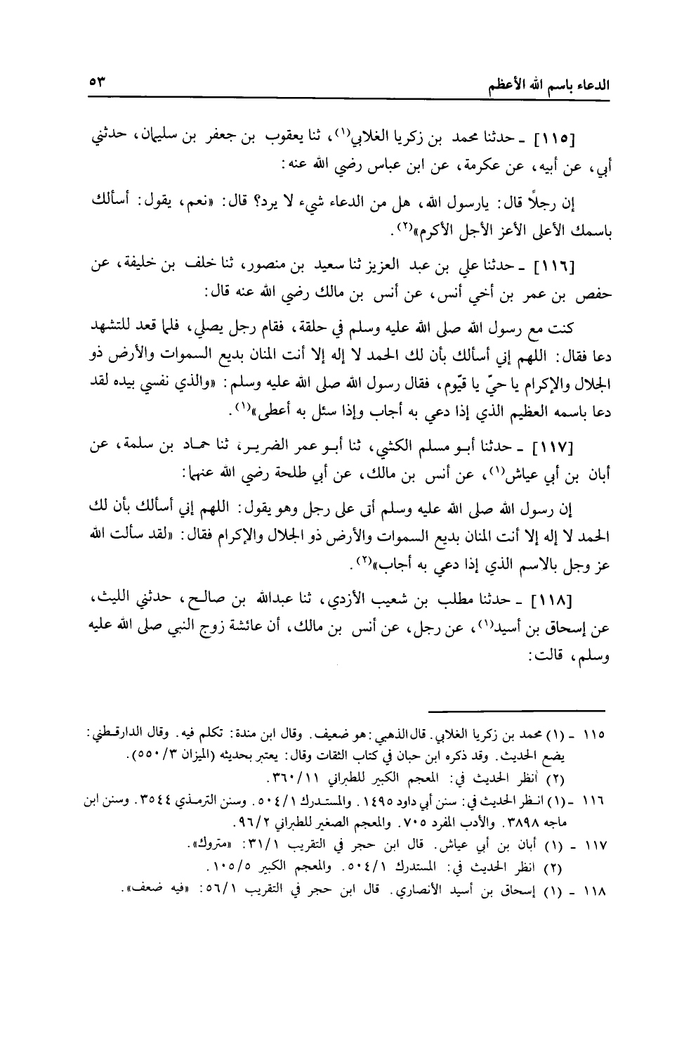 117 - حَدَّثَنَا أَبُو مُسْلِمٍ الْكَشِّيُّ، ثنا أَبُو عُمَرَ الضَّرِيرُ، ثنا حَمَّادُ بْنُ سَلَمَةَ، عَنْ أَبَانَ بْنِ أَبِي عَيَّاشٍ، عَنْ أَنَسِ بْنِ مَالِكٍ، عَنْ أَبِي طَلْحَةَ، رَضِيَ اللَّهُ عَنْهُمَا أَنَّ رَسُولَ اللَّهِ صَلَّى اللهُ عَلَيْهِ وَسَلَّمَ أَتَى عَلَى رَجُلٍ وَهُوَ يَقُولُ: اللَّهُمَّ إِنِّي أَسْأَلُكَ بِأَنَّ لَكَ الْحَمْدَ، لَا إِلَهَ إِلَّا أَنْتَ الْمَنَّانُ، بَدِيعُ السَّمَوَاتِ وَالْأَرْضِ ذُو الْجَلَالِ وَالْإِكْرَامِ فَقَالَ: «§لَقَدْ سَأَلْتَ اللَّهَ عَزَّ وَجَلَّ بِالِاسْمِ الَّذِي إِذَا دُعِيَ بِهِ أَجَابَ»