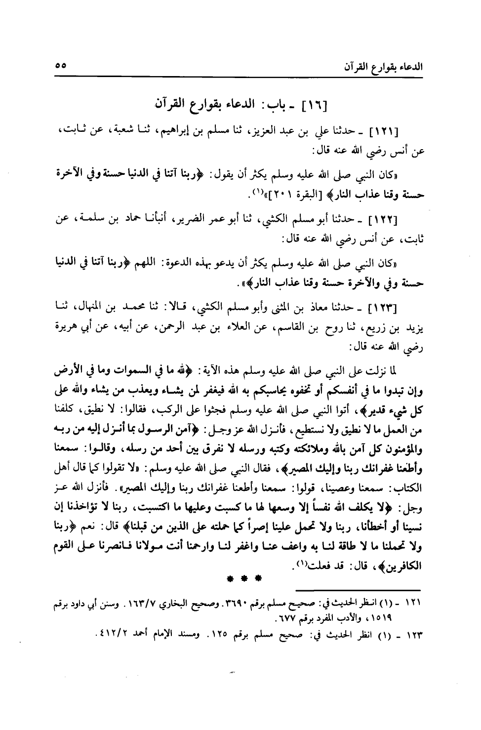 122 - حَدَّثَنَا أَبُو مُسْلِمٍ الْكَشِّيُّ، ثنا أَبُو عُمَرَ الضَّرِيرُ، أَنْبَأَنَا حَمَّادُ بْنُ سَلَمَةَ، عَنْ ثَابِتٍ، عَنْ أَنَسٍ، رَضِيَ اللَّهُ عَنْهُ قَالَ: كَانَ النَّبِيُّ صَلَّى اللهُ عَلَيْهِ وَسَلَّمَ يُكْثِرُ أَنْ يَدْعُوَ بِهَذِهِ الدَّعْوَةِ §اللَّهُمَّ {رَبَّنَا آتِنَا} [البقرة: 201] فِي الدُّنْيَا حَسَنَةً وَفِي الْآخِرَةِ حَسَنَةً وَقِنَا عَذَابَ النَّارِ