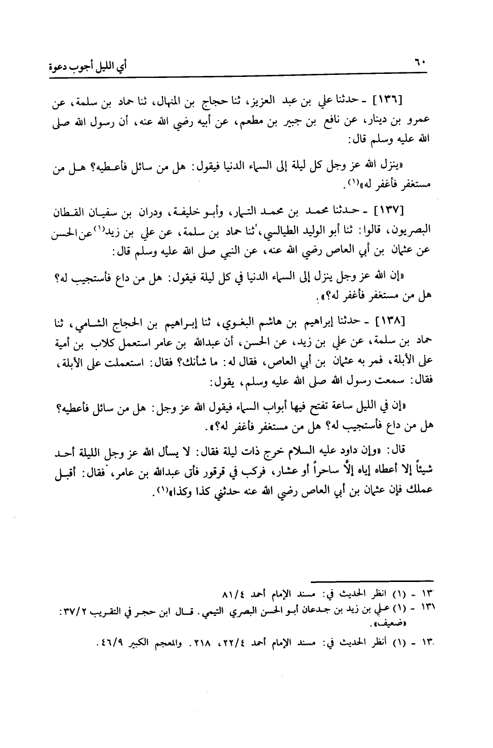 137 - حَدَّثَنَا مُحَمَّدُ بْنُ مُحَمَّدِ التَّمَّارُ، وَأَبُو خَلِيفَةَ، وَدَرَّانُ بْنُ سُفْيَانَ الْقَطَّانُ الْبَصْرِيُّونَ قَالُوا: ثنا أَبُو الْوَلِيدِ الطَّيَالِسِيُّ، ثنا حَمَّادُ بْنُ سَلَمَةَ، عَنْ عَلِيِّ بْنِ زَيْدٍ، عَنِ الْحَسَنِ، عَنْ عُثْمَانَ بْنِ أَبِي الْعَاصِ، رَضِيَ اللَّهُ عَنْهُ عَنِ النَّبِيِّ صَلَّى اللهُ عَلَيْهِ وَسَلَّمَ قَالَ: " إِنَّ §اللَّهَ عَزَّ وَجَلَّ يَنْزِلُ إِلَى السَّمَاءِ الدُّنْيَا فِي كُلِّ لَيْلَةٍ فَيَقُولُ: هَلْ مِنْ دَاعِ فَأَسْتَجِيبَ لَهُ، هَلْ مِنْ مُسْتَغْفِرِ فَأَغْفِرَ لَهُ "