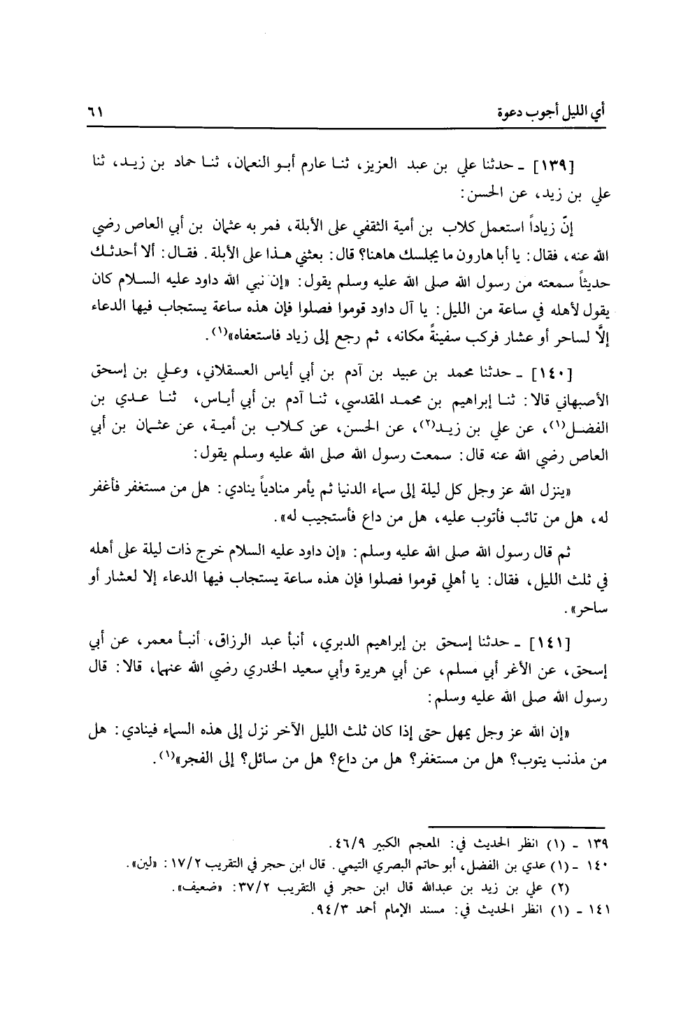 140 - حَدَّثَنَا مُحَمَّدُ بْنُ عُبَيْدِ بْنِ آدَمَ بْنِ أَبِي إِيَاسَ الْعَسْقَلَانِيُّ، وَعَلِيُّ بْنُ إِسْحَاقَ الْأَصْبَهَانِيُّ، قَالَا: ثنا إِبْرَاهِيمُ بْنُ مُحَمَّدٍ الْمَقْدِسِيُّ، ثنا آدَمُ بْنُ أَبِي إِيَاسَ، ثنا عَدِيُّ بْنُ الْفَضْلِ، عَنْ عَلِيِّ بْنِ زَيْدٍ، عَنِ الْحَسَنِ، عَنْ كِلَابِ بْنِ أُمَيَّةَ، عَنْ عُثْمَانَ بْنِ أَبِي الْعَاصِ، رَضِيَ اللَّهُ عَنْهُ قَالَ: سَمِعْتُ رَسُولَ اللَّهِ صَلَّى اللهُ عَلَيْهِ وَسَلَّمَ يَقُولُ: «§يَنْزِلُ اللَّهُ عَزَّ وَجَلَّ كُلَّ لَيْلَةٍ إِلَى سَمَاءِ الدُّنْيَا ثُمَّ يَأْمُرُ مُنَادِيًا يُنَادِي هَلْ مِنْ مُسْتَغْفِرِ فَأَغْفِرَ لَهُ، هَلْ مِنْ تَائِبٍ فَأَتُوبَ عَلَيْهِ، هَلْ مِنْ دَاعِ فَأَسْتَجِيبَ لَهُ» ثُمَّ قَالَ رَسُولُ اللَّهِ صَلَّى اللهُ عَلَيْهِ وَسَلَّمَ: " إِنَّ دَاوُدَ عَلَيْهِ السَّلَامُ خَرَجَ ذَاتَ لَيْلَةٍ عَلَى أَهْلِهِ فِي ثُلُثِ اللَّيْلِ فَقَالَ: يَا أَهْلِي قُومُوا فَصَلُّوا، فَإِنَّ هَذِهِ سَاعَةٌ يُسْتَجَابُ فِيهَا الدُّعَاءُ إِلَّا لِعَشَّارٍ أَوْ سَاحِرٍ "