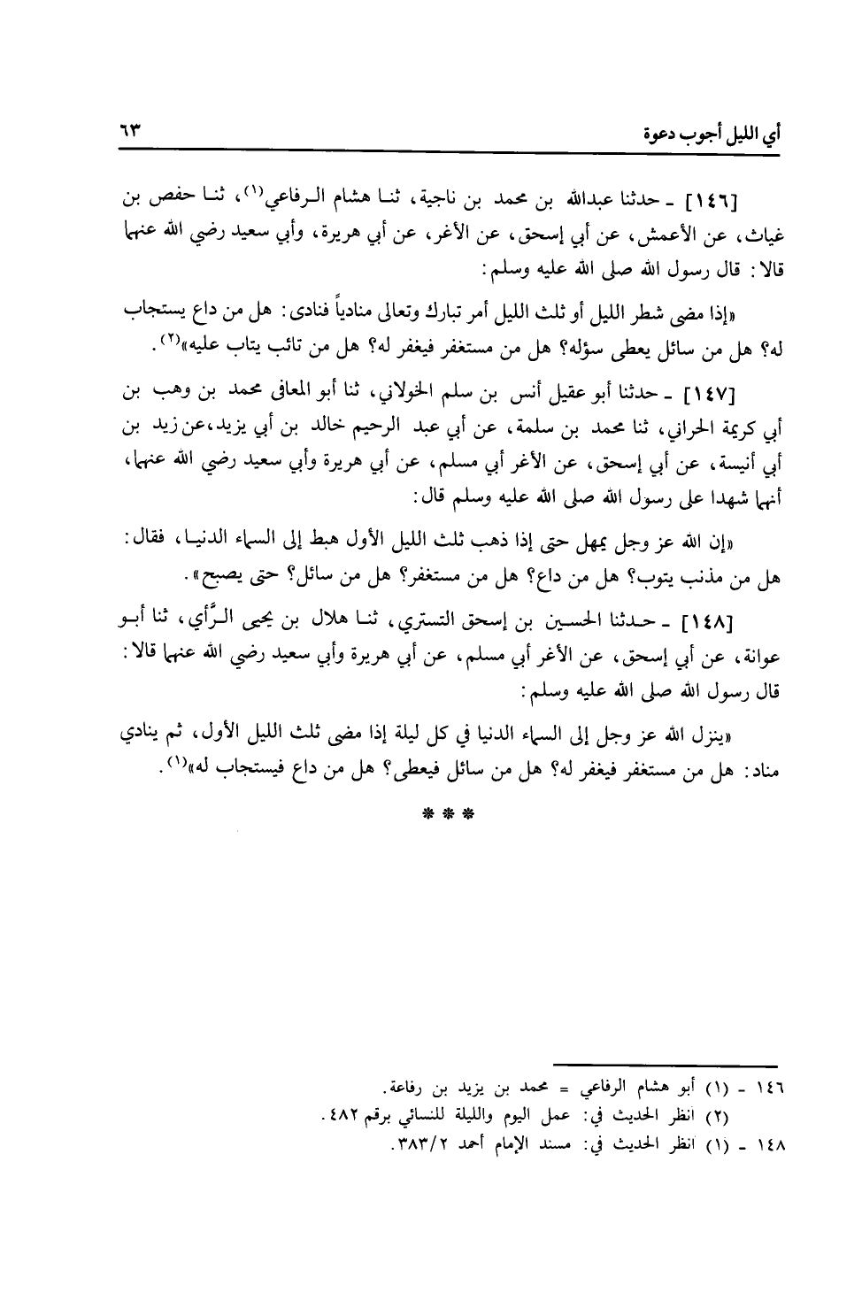 146 - حَدَّثَنَا عَبْدُ اللَّهِ بْنُ مُحَمَّدِ بْنِ نَاجِيَةَ، ثنا أَبُو هِشَامٍ الرِّفَاعِيُّ، ثنا حَفْصُ بْنُ غِيَاثٍ، عَنِ الْأَعْمَشِ، عَنْ أَبِي إِسْحَاقَ، عَنِ الْأَغَرِّ، عَنْ أَبِي هُرَيْرَةَ، وَأَبِي سَعِيدٍ رَضِيَ اللَّهُ عَنْهُمَا قَالَا: قَالَ رَسُولُ صَلَّى اللهُ عَلَيْهِ وَسَلَّمَ: «§إِذَا مَضَى شَطْرُ اللَّيْلِ - أَوْ ثُلُثُ اللَّيْلِ - أَمَرَ تَبَارَكَ وَتَعَالَى مُنَادِيًا فَنَادَى هَلْ مِنْ دَاعِ يُسْتَجَابُ لَهُ، هَلْ مِنْ سَائِلٍ يُعْطَى سُؤْلَهُ، هَلْ مِنْ مُسْتَغْفِرِ فَيُغْفَرَ لَهُ، هَلْ مِنْ تَائِبٍ يُتَابُ عَلَيْهِ»