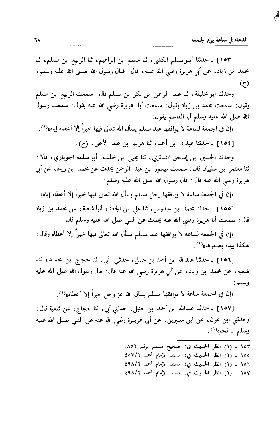 153 - حَدَّثَنَا أَبُو مُسْلِمٍ الْكَشِّيُّ، ثنا مُسْلِمُ بْنُ إِبْرَاهِيمَ، ثنا الرَّبِيعُ بْنُ مُسْلِمٍ، ثنا مُحَمَّدُ بْنُ زِيَادٍ، عَنْ أَبِي هُرَيْرَةَ، رَضِيَ اللَّهُ عَنْهُ قَالَ: قَالَ رَسُولُ اللَّهِ صَلَّى اللهُ عَلَيْهِ وَسَلَّمَ ح وَحَدَّثَنَا أَبُو خَلِيفَةَ، ثنا عَبْدُ الرَّحْمَنِ بْنُ بَكْرِ بْنِ مُسْلِمٍ قَالَ: سَمِعْتُ الرَّبِيعَ بْنَ مُسْلِمٍ يَقُولُ: سَمِعْتُ مُحَمَّدَ بْنَ زِيَادٍ يَقُولُ: سَمِعْتُ أَبَا هُرَيْرَةَ رَضِيَ اللَّهُ عَنْهُ يَقُولُ: سَمِعْتُ رَسُولَ اللَّهِ صَلَّى اللهُ عَلَيْهِ وَسَلَّمَ أَبَا الْقَاسِمِ يَقُولُ: «إِنَّ §فِي الْجُمُعَةِ لَسَاعَةً لَا يُوَافِقُهَا عَبْدٌ مُسْلِمٌ يَسْأَلُ اللَّهَ تَعَالَى فِيهَا خَيْرًا إِلَّا أَعْطَاهُ إِيَّاهُ»