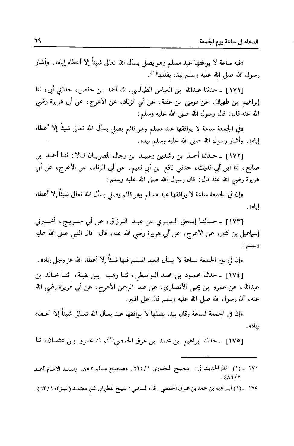 171 - حَدَّثَنَا عَبْدُ اللَّهِ بْنُ الْعَبَّاسِ الطَّيَالِسِيُّ، ثنا أَحْمَدُ بْنُ حَفْصٍ، حَدَّثَنِي أَبِي، ثنا إِبْرَاهِيمُ بْنُ طَهْمَانَ، عَنْ مُوسَى بْنِ عُقْبَةَ، عَنْ أَبِي الزِّنَادِ، عَنِ الْأَعْرَجِ، عَنْ أَبِي هُرَيْرَةَ، رَضِيَ اللَّهُ عَنْهُ قَالَ: قَالَ رَسُولُ اللَّهِ صَلَّى اللهُ عَلَيْهِ وَسَلَّمَ: «§فِي الْجُمُعَةِ سَاعَةٌ لَا يُوَافِقُهَا عَبْدٌ مُسْلِمٌ وَهُوَ قَائِمٌ يُصَلِّي يَسْأَلُ اللَّهَ تَعَالَى شَيْئًا إِلَّا أَعْطَاهُ إِيَّاهُ» وَأَشَارَ رَسُولُ اللَّهِ صَلَّى اللهُ عَلَيْهِ وَسَلَّمَ بِيَدِهِ