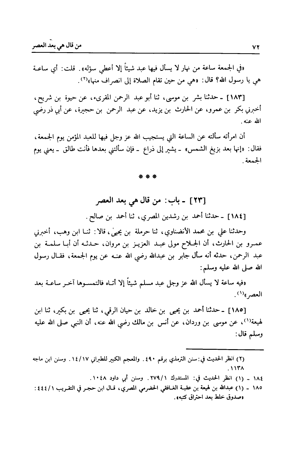 184 - حَدَّثَنَا أَحْمَدُ بْنُ رِشْدِينَ الْمِصْرِيُّ، ثنا أَحْمَدُ بْنُ صَالِحٍ، ح وَحَدَّثَنَا عَلِيُّ بْنُ مُحَمَّدٍ الْأَنْضَنَاوِيُّ، ثنا حَرْمَلَةُ بْنُ يَحْيَى، قَالَا: ثنا ابْنُ وَهْبٍ، أَخْبَرَنِي عَمْرُو بْنُ الْحَارِثِ، أَنَّ الْجُلَاحَ مَوْلَى عَبْدِ الْعَزِيزِ بْنِ مَرْوَانَ حَدَّثَهُ أَنَّ أَبَا سَلَمَةَ بْنَ عَبْدِ الرَّحْمَنِ حَدَّثَهُ أَنَّهُ سَأَلَ جَابِرَ بْنَ عَبْدِ اللَّهِ، رَضِيَ اللَّهُ عَنْهُ عَنْ يَوْمِ الْجُمُعَةِ، فَقَالَ رَسُولُ اللَّهِ صَلَّى اللهُ عَلَيْهِ وَسَلَّمَ: «§فِيهِ سَاعَةٌ لَا يَسْأَلُ اللَّهَ عَزَّ وَجَلَّ عَبْدٌ مُسْلِمٌ شَيْئًا إِلَّا أَتَاهُ إِيَّاهُ فَالْتَمِسُوهَا آخِرَ سَاعَةٍ بَعْدَ الْعَصْرِ»