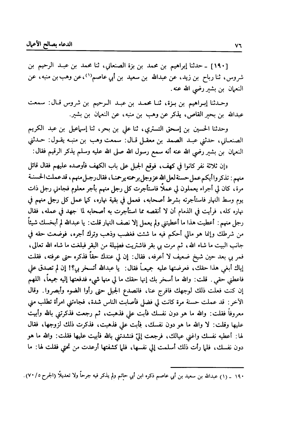 190 - حَدَّثَنَا إِبْرَاهِيمُ بْنُ مُحَمَّدِ بْنِ بَزَّةَ الصَّنْعَانِيُّ، ثنا مُحَمَّدُ بْنُ عَبْدِ الرَّحِيمِ بْنِ شَرُوسٍ، ثنا رَبَاحُ بْنُ زَيْدٍ، عَنْ عَبْدِ اللَّهِ بْنِ سَعِيدِ بْنِ أَبِي عَاصِمٍ، عَنْ وَهْبِ بْنِ مُنَبِّهٍ، عَنِ النُّعْمَانِ بْنِ بَشِيرٍ، رَضِيَ اللَّهُ عَنْهُ ح وَحَدَّثَنَا إِبْرَاهِيمُ بْنُ بَزَّةَ، ثنا مُحَمَّدُ بْنُ عَبْدِ الرَّحِيمِ بْنِ شَرُوسٍ، قَالَ: سَمِعْتُ عَبْدَ اللَّهِ بْنَ بَحِيرٍ الْقَاصَّ، يَذْكُرُ عَنْ وَهْبِ بْنِ مُنَبِّهٍ، عَنِ النُّعْمَانِ بْنِ بَشِيرٍ، ح وَحَدَّثَنَا الْحُسَيْنُ بْنُ إِسْحَاقَ التُّسْتَرِيُّ، ثنا عَلِيُّ بْنُ بَحْرٍ، ثنا إِسْمَاعِيلُ بْنُ عَبْدِ الْكَرِيمِ الصَّنْعَانِيُّ، حَدَّثَنِي عَبْدُ الصَّمَدِ بْنِ مَعْقِلٍ، قَالَ: سَمِعْتُ وَهْبَ بْنَ مُنَبِّهٍ، يَقُولُ: حَدَّثَنِي النُّعْمَانُ بْنُ بَشِيرٍ، رَضِيَ اللَّهُ عَنْهُ أَنَّهُ سَمِعَ رَسُولَ اللَّهِ صَلَّى اللهُ عَلَيْهِ وَسَلَّمَ يَذْكُرُ الرَّقِيمَ فَقَالَ: " إِنَّ §ثَلَاثَةَ نَفَرٍ كَانُوا فِي كَهْفٍ فَوَقَعَ الْجَبَلُ عَلَى بَابِ الْكَهْفِ فَأَوْصَدَهُ عَلَيْهِمْ، فَقَالَ قَائِلٌ مِنْهُمْ: تَذَكَّرُوا أَيُّكُمْ عَمِلَ حَسَنَةً لَعَلَّ اللَّهَ عَزَّ وَجَلَّ بِرَحْمَتِهِ يَرْحَمُنَا، فَقَالَ رَجُلٌ مِنْهُمْ: قَدْ عَمِلْتُ الْحَسَنَةَ مَرَّةً كَانَ لِي أُجَرَاءُ يَعْمَلُونَ لِي عَمَلًا، فَاسْتَأْجَرْتُ كُلَّ رَجُلٍ مِنْهُمْ بِأَجْرٍ مَعْلُومٍ فَجَاءَنِي رَجُلٌ ذَاتَ يَوْمٍ وَسَطَ النَّهَارِ فَاسْتَأْجَرْتُهُ بِشَرْطِ أَصْحَابِهِ فَعَمِلَ فِي بَقِيَّةِ نَهَارِهِ كَمَا عَمِلَ كُلُّ رَجُلٍ مِنْهُمْ فِي نَهَارِهِ كُلِّهِ فَرَأَيْتُ فِيَ الذِّمَامِ أَنْ لَا أُنْقِصَهُ مِمَّا اسْتَأْجَرْتُ بِهِ أَصْحَابَهُ لِمَا جَهِدَ فِي عَمَلِهِ، فَقَالَ رَجُلٌ مِنْهُمْ أَعْطَيْتَ هَذَا مَا أَعْطَيْتَنِي وَلَمْ يَعْمَلْ إِلَّا نِصْفَ النَّهَارِ، قُلْتُ: يَا عَبْدَ اللَّهِ لَمْ أَبْخَسْكَ شَيْئًا مِنْ شَرْطِكَ وَإِنَّمَا هُوَ مَالِي أَحْكُمُ فِيهِ مَا شِئْتُ، فَغَضِبَ وَذَهَبَ وَتَرَكَ أَجْرَهُ، فَوَضَعْتُ حَقَّهُ فِي جَانِبِ الْبَيْتِ مَا شَاءَ اللَّهُ، ثُمَّ مَرَّتْ بِي بَقَرٌ فَاشْتَرَيْتُ فَصِيلَةً مِنَ الْبَقَرِ فَبَلَغَتْ مَا شَاءَ اللَّهُ تَعَالَى، فَمَرَّ بِي بَعْدَ حِينٍ شَيْخٌ ضَعِيفٌ لَا أَعْرِفُهُ فَقَالَ إِنَّ لِي عِنْدَكَ حَقًّا فَذَكَرَهُ حَتَّى عَرَفْتُهُ فَقُلْتُ: إِيَّاكَ أَبْغِي، هَذَا حَقُّكَ فَعَرَضْتُهَا عَلَيْهِ جَمِيعًا فَقَالَ: يَا عَبْدَ اللَّهِ أَتَسْخَرُ بِي إِنْ لَمْ تَصَدَّقْ عَلَيَّ فَأَعْطِنِي حَقِّي، قُلْتُ: وَاللَّهِ مَا أَسْخَرُ بِكَ إِنَّهَا حَقَّكَ مَا لِي مِنْهَا شَيْءٌ فَدَفَعْتُهَا إِلَيْهِ جَمِيعًا، اللَّهُمَّ إِنْ كُنْتُ فَعَلْتُ ذَلِكَ لِوَجْهِكَ فَافْرُجْ عَنَّا فَانْصَدَعَ الْجَبَلُ حَتَّى رَأَوُا الضَّوْءَ وَأَبْصَرُوا، وَقَالَ الْآخَرُ: قَدْ عَمِلْتُ حَسَنَةً مَرَّةً، كَانَتْ لِي فَضْلٌ فَأَصَابَتِ النَّاسَ شِدَّةٌ فَجَاءَتْنِي امْرَأَةٌ تَطْلُبُ مِنِّي مَعْرُوفًا، فَقُلْتُ: وَاللَّهِ مَا هُوَ دُونَ نَفْسِكِ، فَأَبَتْ عَلَيَّ، فَذَهَبَتْ ثُمَّ رَجَعَتْ، فَذَكَّرَتْنِي بِاللَّهِ وَأَبَيْتُ عَلَيْهَا، وَقُلْتُ: لَا وَاللَّهِ مَا هُوَ دُونَ نَفْسِكِ، فَأَبَتْ عَلَيَّ، فَذَهَبَتْ فَذَكَرَتْ ذَلِكَ لِزَوْجِهَا فَقَالَ لَهَا أَعْطِيهِ نَفْسَكِ وَاغْنِي عِيَالَكِ، فَرَجَعَتْ إِلَيَّ فَنَشَدَتْنِي بِاللَّهِ فَأَبَيْتُ عَلَيْهَا، فَقُلْتُ: وَاللَّهِ مَا هُوَ دُونَ نَفْسِكِ، فَلَمَّا رَأَتْ ذَلِكَ أَسْلَمَتْ إِلَيَّ نَفْسَهَا فَلَمَّا كَشَفْتُهَا أُرْعِدَتْ مِنْ تَحْتِي، فَقُلْتُ لَهَا: مَا -[77]- شَأْنُكِ؟ فَقَالَتْ: أ