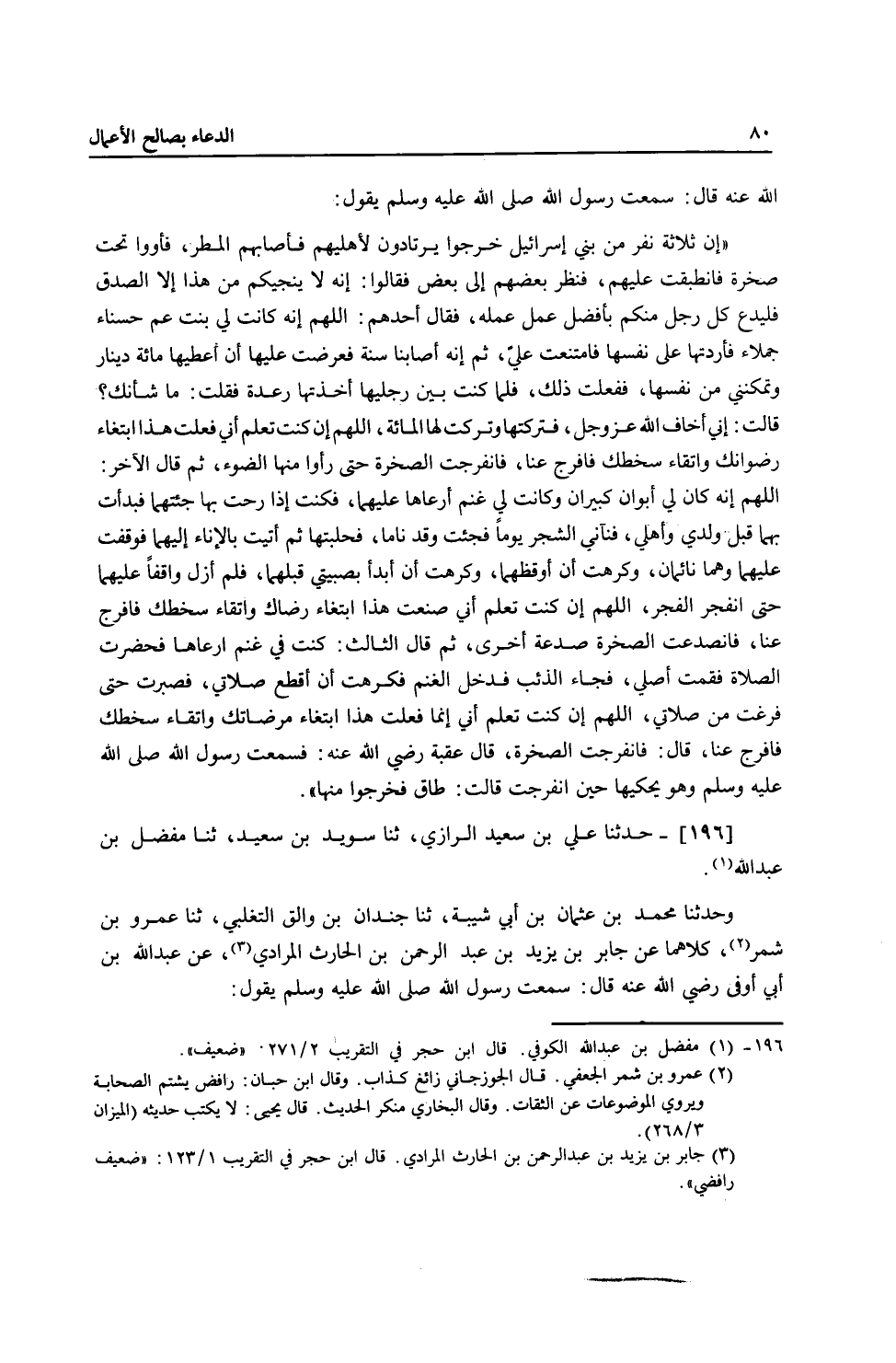 196 - حَدَّثَنَا عَلِيُّ بْنُ سَعِيدٍ الرَّازِيُّ، ثنا سُوَيْدُ بْنُ سَعِيدٍ، ثنا مُفَضَّلُ بْنُ عَبْدِ اللَّهِ، ح وَحَدَّثَنَا مُحَمَّدُ بْنُ عُثْمَانَ بْنِ أَبِي شَيْبَةَ، ثنا جُنْدَلُ بْنُ وَالِقٍ التَّغْلِبِيُّ، ثنا عَمْرُو بْنُ شِمْرٍ، كِلَاهُمَا عَنْ جَابِرِ بْنِ يَزِيدَ عَنْ عَبْدِ الرَّحْمَنِ بْنِ الْحَارِثِ الْمُرَادِيِّ، عَنْ عَبْدِ اللَّهِ بْنِ أَبِي أَوْفَى، رَضِيَ اللَّهُ عَنْهُ قَالَ سَمِعْتُ رَسُولَ اللَّهِ صَلَّى اللهُ عَلَيْهِ وَسَلَّمَ يَقُولُ -[81]-: " §خَرَجَ ثَلَاثَةُ نَفَرٍ يَمْشُونَ فَبَيْنَمَا هُمْ يَعْبُدُونَ اللَّهَ عَزَّ وَجَلَّ فَأَوَوْا إِلَى كَهْفٍ فَخَرَّتْ صَخْرَةٌ مِنْ أَعْلَى الْجَبَلِ حَتَّى الْتَقَمَتْ بَابَ الْغَارِ، فَقَالَ بَعْضُهُمْ لِبَعْضٍ: يَا عِبَادَ اللَّهِ وَاللَّهِ لَا يُنْجِيكُمْ مِمَّا وَقَعْتُمْ فِيهِ إِلَّا أَنْ تَصْدُقُوا اللَّهَ عَزَّ وَجَلَّ، فَهَاتُوا مَا عَمِلْتُمْ خَالِصًا فَإِنَّمَا ابْتُلِيتُمْ بِالذُّنُوبِ، فَقَالَ أَحَدُهُمُ: اللَّهُمَّ إِنْ كُنْتَ تَعْلَمُ أَنِّي طَلَبْتُ حَبِيبَةً لِحُسْنِهَا وَجَمَالِهَا وَأَعْطَيْتُ فِيهَا مَالًا ضَخْمًا حَتَّى إِذَا قَدَرْتُ عَلَيْهَا وَجَلَسْتُ مِنْهَا مَجْلِسَ الرَّجُلِ مِنَ الْمَرْأَةِ ذَكَرْتُ النَّارَ فَقُمْتُ عَنْهَا فَرَقًا مِنْكَ، اللَّهُمَّ ارْفَعْ عَنَّا هَذِهِ الصَّخْرَةَ فَانْصَدَعَتْ حَتَّى إِذَا نَظَرُوا إِلَى الضَّوْءِ، ثُمَّ قَالَ الْآخَرُ: اللَّهُمَّ إِنْ كُنْتَ تَعْلَمُ أَنِّي اسْتَأْجَرْتُ قَوْمًا يَحْرُثُ كُلُّ رَجُلٍ مِنْهُمْ بِنِصْفِ دِرْهَمٍ فَلَمَّا فَرَغُوا أَعْطَيْتُهُمْ أُجُورَهُمْ فَقَالَ أَحَدُهُمْ: وَاللَّهِ لَقَدْ عَمِلْتُ عَمَلَ اثْنَيْنِ وَاللَّهِ لَا آخُذُ إِلَّا دِرْهَمًا، فَذَهَبَ وَتَرَكَ مَا فِي يَدِي، فَبَذَرْتُ مِنْ ذَلِكَ النِّصْفِ دِرْهَمٍ، فَأَخْرَجَ اللَّهُ عَزَّ وَجَلَّ مِنْ ذَلِكَ رِزْقًا كَثِيرًا، فَجَاءَ صَاحِبُ النِّصْفِ دِرْهَمٍ فَأَرَادَهُ فَدَفَعْتُ إِلَيْهِ عَشْرَةَ آلَافِ دِرْهَمٍ، اللَّهُمَّ إِنْ كُنْتَ تَعْلَمُ أَنِّي فَعَلْتُ ذَلِكَ خَوْفًا مِنْكَ فَارْفَعْ عَنَّا هَذِهِ الصَّخْرَةَ، فَانْفَرَجَتْ حَتَّى نَظَرَ بَعْضُهُمْ إِلَى بَعْضٍ، وَقَالَ الْآخَرُ: اللَّهُمَّ إِنْ كُنْتَ تَعْلَمُ أَنَّ أَبِي وَأُمِّي كَانَا نَائِمَيْنِ فَأَتَيْتُهُمَا بِقَعْبٍ مِنْ لَبَنٍ فَخِفْتُ أَنْ أَضَعَهُ فَتَقَعُ فِيهِ هَامَةٌ وَكَرِهْتُ أَنْ أُوقِظَهُمَا مِنْ نَوْمِهِمَا فَيَشُقُّ ذَلِكَ عَلَيْهِمَا فَلَمْ أَزَلْ كَذَلِكَ حَتَّى اسْتَيْقَظَا فَشَرِبَا، اللَّهُمَّ إِنْ كُنْتَ تَعْلَمُ أَنِّي فَعَلْتُ هَذَا ابْتِغَاءَ وَجْهِكَ فَافْرُجْ عَنَّا هَذِهِ الصَّخْرَةَ، قَالَ: فَانْفَرَجَتْ حَتَّى سَهُلَ لَهُمْ طَرِيقُهُمْ حَتَّى خَرَجُوا سَالِمِينَ " ثُمَّ قَالَ نَبِيُّ اللَّهِ صَلَّى اللهُ عَلَيْهِ وَسَلَّمَ: «مَنْ صَدَقَ اللَّهَ نَجَا»