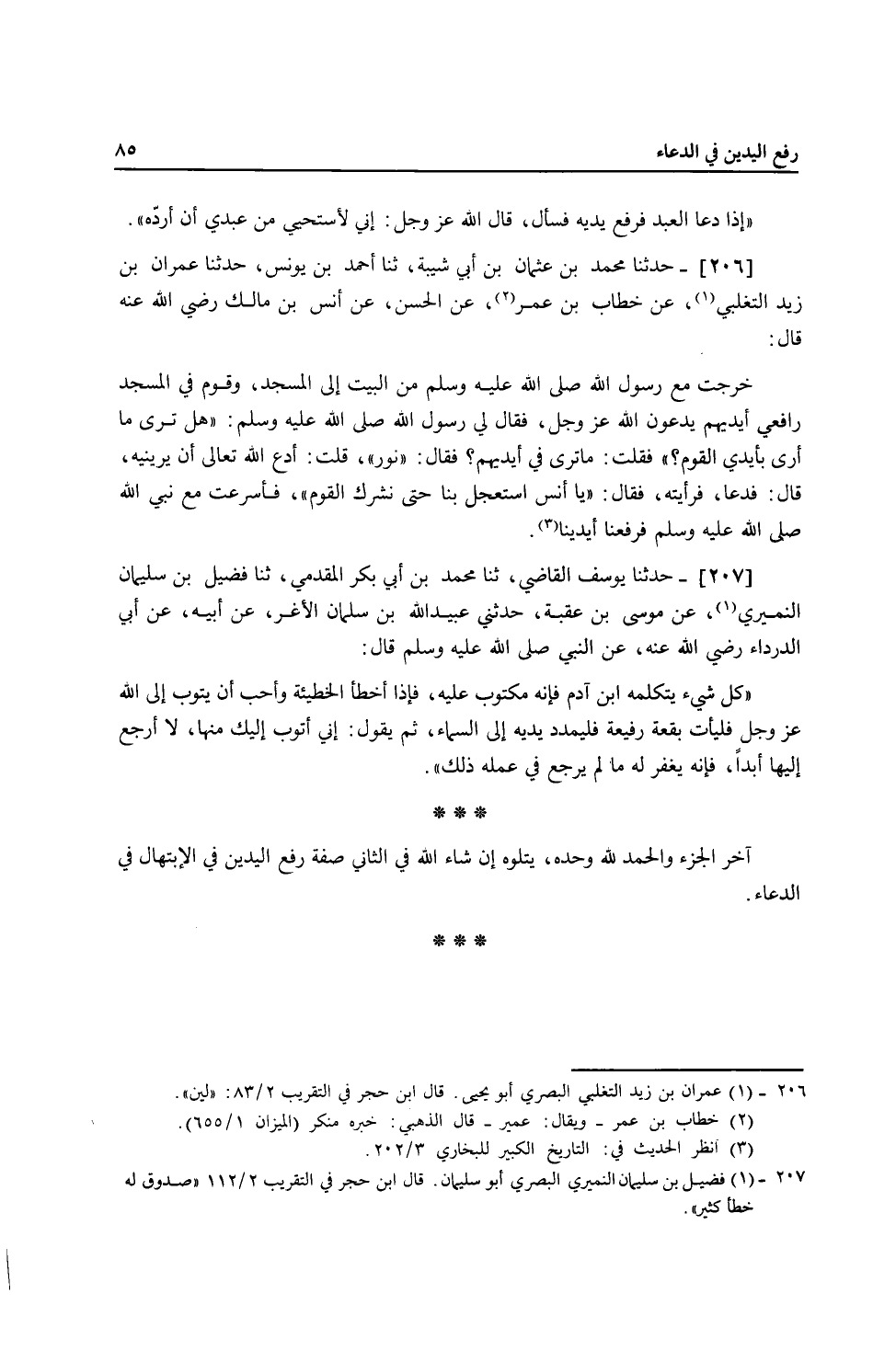 206 - حَدَّثَنَا مُحَمَّدُ بْنُ عُثْمَانَ بْنِ أَبِي شَيْبَةَ، ثنا أَحْمَدُ بْنُ يُونُسَ، ثَنَا عِمْرَانُ بْنُ زَيْدٍ التَّغْلِبِيُّ، عَنْ خَطَّابِ بْنِ عُمَرَ، عَنِ الْحَسَنِ، عَنْ أَنَسِ بْنِ مَالِكٍ، رَضِيَ اللَّهُ عَنْهُ قَالَ: خَرَجْتُ مَعَ رَسُولِ اللَّهِ صَلَّى اللهُ عَلَيْهِ وَسَلَّمَ مِنَ الْبَيْتِ إِلَى الْمَسْجِدِ وَقَوْمٌ فِي الْمَسْجِدِ رَافِعِي أَيْدِيهِمْ يَدْعُونَ اللَّهَ عَزَّ وَجَلَّ، فَقَالَ لِي رَسُولُ اللَّهِ صَلَّى اللهُ عَلَيْهِ وَسَلَّمَ: «§هَلْ تَرَى مَا أَرَى بِأَيْدِي الْقَوْمِ؟» فَقُلْتُ: مَا تَرَى فِي أَيْدِيهِمْ؟ فَقَالَ: «نُورٌ» قُلْتُ: ادْعُ اللَّهَ تَعَالَى أَنْ يُرِينِيهِ، قَالَ: فَدَعَا فَرَأَيْتُهُ، فَقَالَ: «يَا أَنَسُ اسْتَعْجِلْ بِنَا حَتَّى نَشْرَكَ الْقَوْمَ» فَأَسْرَعْتُ مَعَ نَبِيِّ اللَّهِ صَلَّى اللهُ عَلَيْهِ وَسَلَّمَ فَرَفَعْنَا أَيْدِيَنَا