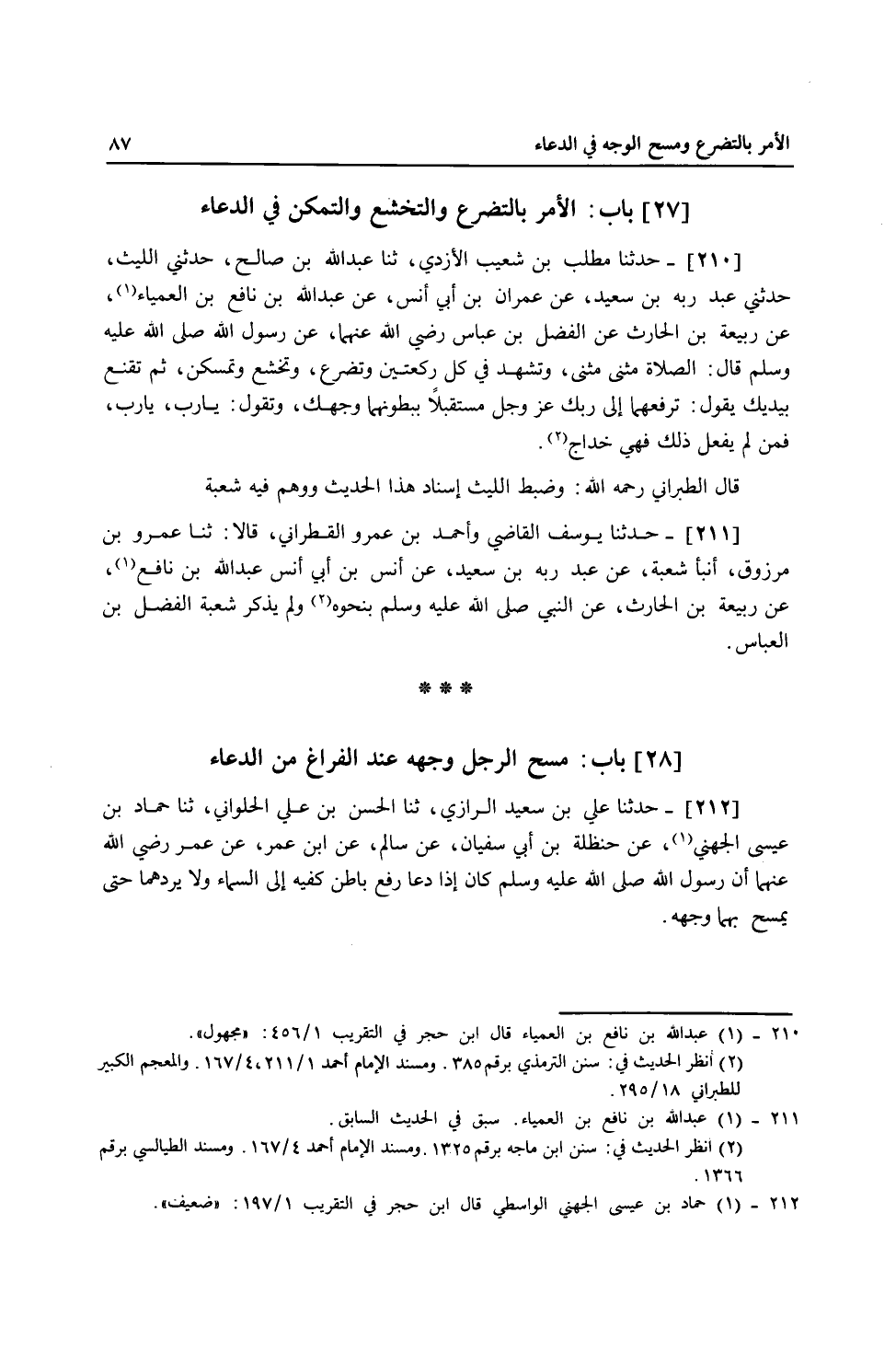 210 - حَدَّثَنَا مُطَّلِبُ بْنُ شُعَيْبٍ الْأَزْدِيُّ، ثنا عَبْدُ اللَّهِ بْنُ صَالِحٍ، حَدَّثَنِي اللَّيْثُ، حَدَّثَنِي عَبْدُ رَبِّهِ بْنُ سَعِيدٍ، عَنْ عِمْرَانَ بْنِ أَبِي أَنَسٍ، عَنْ عَبْدِ اللَّهِ بْنِ نَافِعِ بْنِ الْعَمْيَاءِ، عنْ رَبِيعَةَ بْنِ الْحَارِثِ، عَنِ الْفَضْلِ بْنِ عَبَّاسٍ، رَضِيَ اللَّهُ عَنْهُمَا، عَنْ رَسُولِ اللَّهِ صَلَّى اللهُ عَلَيْهِ وَسَلَّمَ قَالَ: " §الصَّلَاةُ مَثْنَى مَثْنَى، وَتَشَهُّدٌ فِي كُلِّ رَكْعَتَيْنِ، وَتَضَرُّعٌ وَتَخَشُّعٌ وَتَمَسْكُنٌ، ثُمَّ تَقَنَّعْ بِيَدَيْكَ - يَقُولُ تَرْفَعُهُمَا إِلَى رَبِّكَ عَزَّ وَجَلَّ مُسْتَقْبِلًا بِبُطُونِهِمَا وَجْهَكَ وَتَقُولُ: يَا رَبِّ، يَا رَبِّ، فَمَنْ لَمْ يَفْعَلْ ذَلِكَ فَهِيَ خِدَاجٌ " قَالَ الطَّبَرَانِيُّ رَحِمَهُ اللَّهُ: وَضَبَطَ اللَّيْثُ إِسْنَادَ هَذَا الْحَدِيثِ وَوَهِمَ فِيهِ شُعْبَةُ