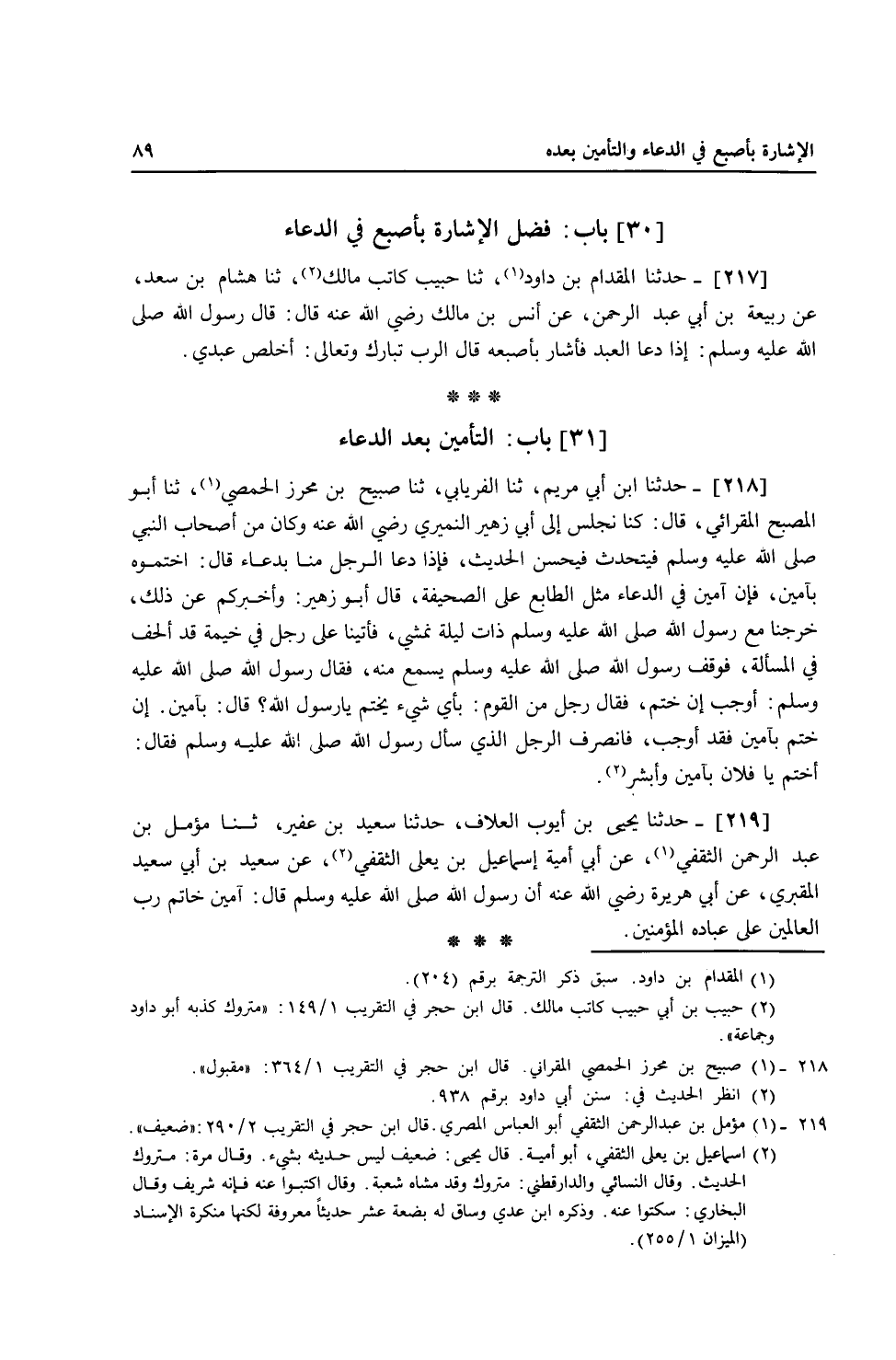 217 - حَدَّثَنَا الْمِقْدَامُ بْنُ دَاوُدَ، ثنا حَبِيبٌ، كَاتِبُ مَالِكٍ، ثنا هِشَامُ بْنُ سَعْدٍ، عَنْ رَبِيعَةَ بْنِ أَبِي عَبْدِ الرَّحْمَنِ، عَنْ أَنَسِ بْنِ مَالِكٍ، رَضِيَ اللَّهُ عَنْهُ قَالَ: قَالَ رَسُولُ اللَّهِ صَلَّى اللهُ عَلَيْهِ وَسَلَّمَ: " §إِذَا دَعَا الْعَبْدُ فَأَشَارَ بِأُصْبُعِهِ قَالَ الرَّبُّ تَبَارَكَ وَتَعَالَى: أَخْلَصَ عَبْدِي "