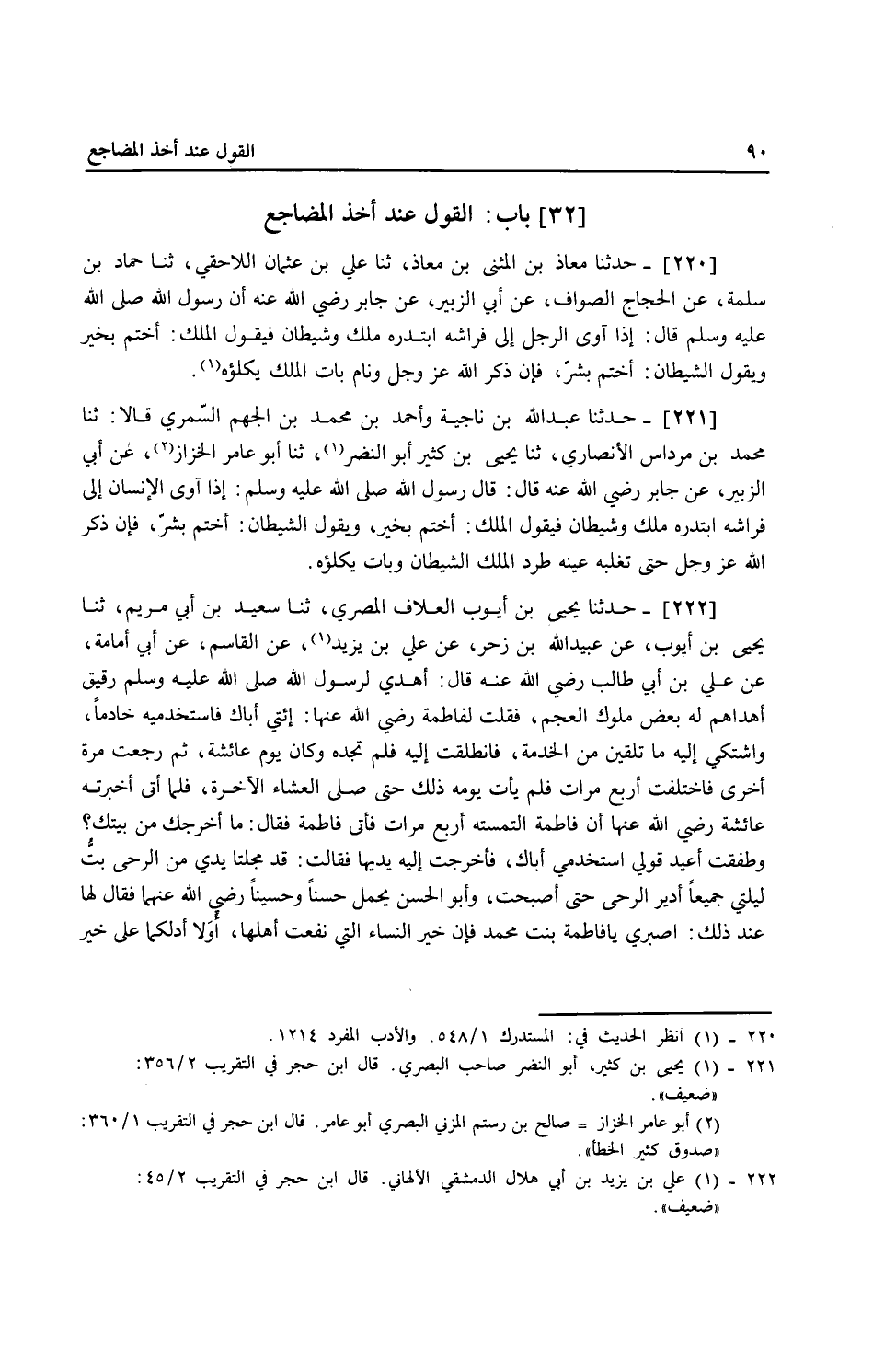 222 - حَدَّثَنَا يَحْيَى بْنُ أَيُّوبَ الْعَلَّافُ الْمِصْرِيُّ، ثنا سَعِيدُ بْنُ أَبِي مَرْيَمَ، ثنا يَحْيَى بْنُ أَيُّوبَ، عَنْ عُبَيْدِ اللَّهِ بْنِ زَحْرٍ، عَنْ عَلِيِّ بْنِ يَزِيدَ، عَنِ الْقَاسِمِ، عَنْ أَبِي أُمَامَةَ، عَنْ عَلِيِّ بْنِ أَبِي طَالِبٍ، رَضِيَ اللَّهُ عَنْهُ قَالَ: أُهْدِي لِرَسُولِ اللَّهِ صَلَّى اللهُ عَلَيْهِ وَسَلَّمَ رَقِيقٌ أَهدْاهُمْ لَهُ بَعْضُ مُلُوكِ الْعَجَمِ، فَقُلْتُ لِفَاطِمَةَ رَضِيَ اللَّهُ عَنْهَا: ائْتِي أَبَاكِ فَاسْتَخْدِمِيهِ خَادِمًا وَاشْتَكِي إِلَيْهِ مَا تَلْقَيْنَ مِنَ الْخِدْمَةِ، فَانْطَلَقَتْ إِلَيْهِ فَلَمْ تَجِدْهُ، وَكَانَ يَوْمَ عَائِشَةَ، ثُمَّ رَجَعَتْ مَرَّةً أُخْرَى فَاخْتَلَفَتْ أَرْبَعَ مَرَّاتٍ فَلَمْ يَأْتِ يَوْمَهُ ذَلِكَ حَتَّى صَلَّى الْعِشَاءَ الْآخِرَةَ، فَلَمَّا أَتَى أَخْبَرَتْهُ عَائِشَةُ رَضِيَ اللَّهُ عَنْهَا أَنَّ فَاطِمَةَ الْتَمَسَتْهُ أَرْبَعَ مَرَّاتٍ، فَأَتَى فَاطِمَةَ فَقَالَ: «مَا أَخْرَجَكِ مِنْ بَيْتِكِ» وَطَفِقْتُ أُعِيدُ قُولِي اسْتَخْدِمِي أَبَاكِ، فَأَخْرَجَتْ إِلَيْهِ يَدَيْهَا فَقَالَتْ: قَدْ مَجِلَتَا يَدِي مِنَ الرَّحَى، بِتُّ لَيْلَتِي جَمِيعًا أُدِيرُ الرَّحَى حَتَّى أَصْبَحْتُ وَأَبُو الْحَسَنِ يَحْمِلُ حَسَنًا وَحُسَيْنًا رَضِيَ اللَّهُ عَنْهُمَا فَقَالَ لَهَا عِنْدَ ذَلِكَ: «اصْبِرِي يَا فَاطِمَةُ بِنْتَ مُحَمَّدٍ فَإِنَّ خَيْرَ النِّسَاءِ الَّتِي نَفَعَتْ أَهْلَهَا، أَوَلَا أَدُلُّكُمَا عَلَى خَيْرٍ -[91]- مِنَ الَّذِي تُرِيدَانِ، §إِذَا أَخَذْتُمَا مَضْجَعَكُمَا فَكَبِّرَا اللَّهَ ثَلَاثًا وَثَلَاثِينَ، وَاحْمَدَا اللَّهَ ثَلَاثًا وَثَلَاثِينَ، وَسَبِّحَا اللَّهَ ثَلَاثًا وَثَلَاثِينَ، ثُمَّ اخْتِمَا بِلَا إِلَهَ إِلَّا اللَّهُ، فَذَلِكَ خَيْرٌ لَكُمَا مِنَ الَّذِي تُرِيدَانِ وَمِنَ الدُّنْيَا وَمَا فِيهَا»