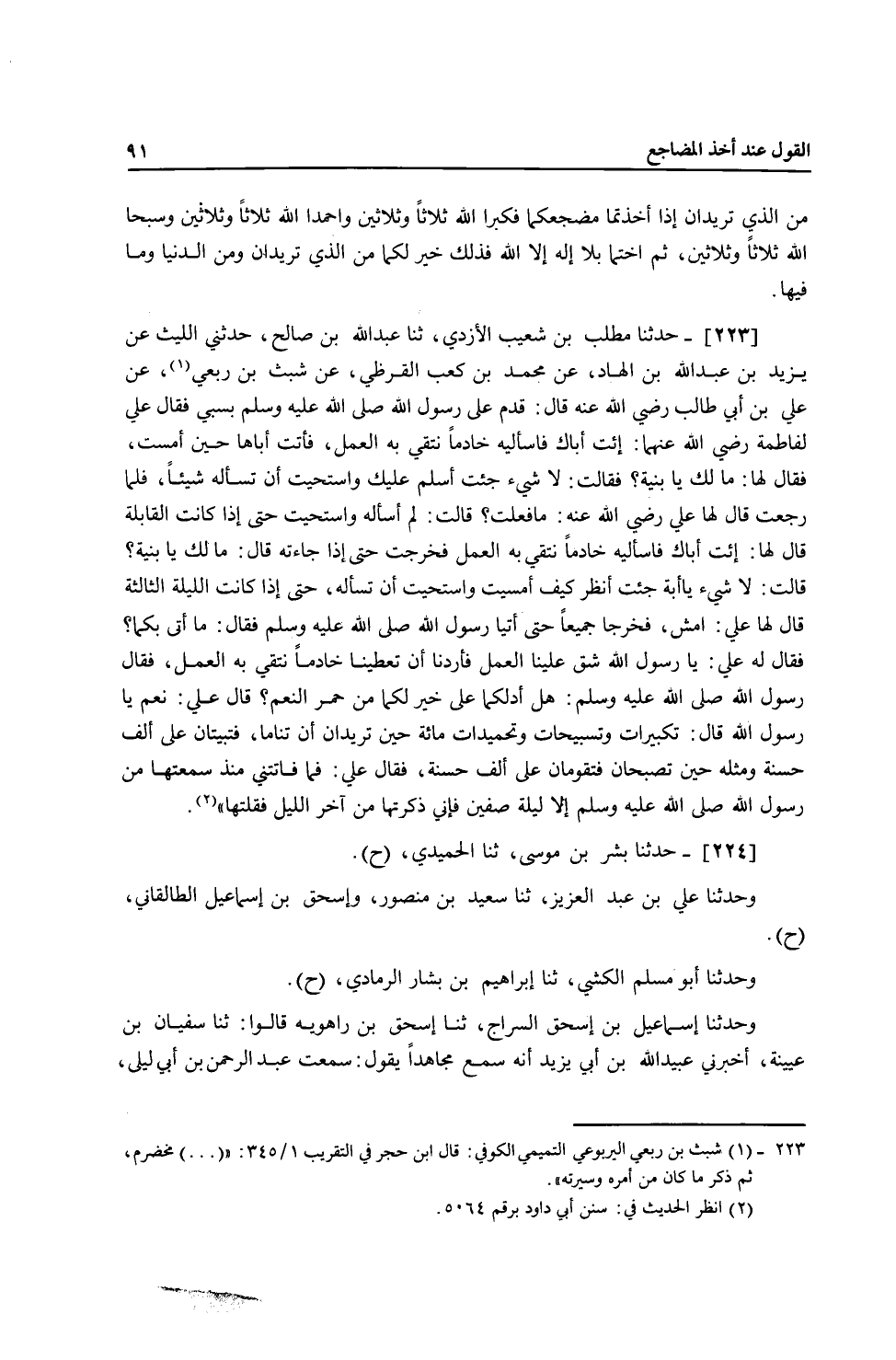 223 - حَدَّثَنَا مُطَّلِبُ بْنُ شُعَيْبٍ الْأَزْدِيُّ، ثنا عَبْدُ اللَّهِ بْنُ صَالِحٍ، حَدَّثَنِي اللَّيْثُ، عَنْ يَزِيدَ بْنِ عَبْدِ اللَّهِ بْنِ الْهَادِ، عَنْ مُحَمَّدِ بْنِ كَعْبٍ الْقُرَظِيِّ، عَنْ شَبَثِ بْنِ رِبْعِيٍّ، عَنْ عَلِيِّ بْنِ أَبِي طَالِبٍ، رَضِيَ اللَّهُ عَنْهُ قَالَ: قُدِمَ عَلَى رَسُولِ اللَّهِ صَلَّى اللهُ عَلَيْهِ وَسَلَّمَ بِسَبْي فَقَالَ عَلِيٌّ لِفَاطِمَةَ رَضِيَ اللَّهُ عَنْهُمَا: ائْتِ أَبَاكِ فَاسْأَلِيهِ خَادِمًا نَتَّقِي بِهِ الْعَمَلَ، فَأَتَتْ أَبَاهَا حِينَ أَمْسَتْ فَقَالَ لَهَا: مَا لَكِ يَا بُنَيَّةُ؟ " فَقَالَتْ: لَا شَيْءَ جِئْتُ أُسَلِّمُ عَلَيْكَ، وَاسْتَحْيَتْ أَنْ تَسْأَلَهُ شَيْئًا فَلَمَّا رَجَعَتْ قَالَ لَهَا عَلِيٌّ رَضِيَ اللَّهُ عَنْهُ: مَا فَعَلْتِ؟ قَالَتْ: لَمْ أَسْأَلْهُ وَاسْتَحَيْتُ، حَتَّى إِذَا كَانَتِ الْقَابِلَةُ قَالَ لَهَا: ائْتِ أَبَاكِ فَاسْأَلِيهِ خَادِمًا نَتَّقِي بِهِ الْعَمَلَ، فَخَرَجَتْ حَتَّى إِذَا جَاءَتْهُ قَالَ: «مَا لَكِ يَا بُنَيَّةُ؟» قَالَتْ: لَا شَيْءَ يَا أَبَهْ، جِئْتُ أَنْظُرُ كَيْفَ أَمْسَيْتَ، وَاسْتَحْيَتْ أَنْ تَسْأَلَهُ، حَتَّى إِذَا كَانَتِ اللَّيْلَةُ الثَّالِثَةُ قَالَ لَهَا عَلِيٌّ: امْشِ فَخَرَجَا جَمِيعًا حَتَّى أَتَيَا رَسُولَ اللَّهِ صَلَّى اللهُ عَلَيْهِ وَسَلَّمَ فَقَالَ: «مَا أَتَى بِكُمَا؟» فَقَالَ لَهُ عَلِيٌّ: يَا رَسُولَ اللَّهِ شَقَّ عَلَيْنَا الْعَمَلُ فَأَرَدْنَا أَنْ تُعْطِيَنَا خَادِمًا نَتَّقِي بِهِ الْعَمَلَ، فَقَالَ رَسُولُ اللَّهِ صَلَّى اللهُ عَلَيْهِ وَسَلَّمَ: «هَلْ أَدُلُّكُمَا عَلَى خَيْرٍ لَكُمَا مِنْ حُمْرِ النَّعَمِ؟» قَالَ عَلِيٌّ: نَعَمْ يَا رَسُولَ اللَّهِ، قَالَ: «§تَكْبِيرَاتٍ وَتَسْبِيحَاتٍ وَتَحْمِيدَاتٍ مِائَةً حِينَ تُرِيدَانِ أَنْ تَنَامَا فَتَبِيتَانِ عَلَى أَلْفِ حَسَنَةٍ، وَمِثْلُهُ حِينَ تُصْبِحَانِ فَتَقُومَانِ عَلَى أَلْفِ حَسَنَةٍ» فَقَالَ عَلِيٌّ: فَمَا فَاتَتْنِي مُنْذُ سَمِعْتُهَا مِنْ رَسُولِ اللَّهِ صَلَّى اللهُ عَلَيْهِ وَسَلَّمَ إِلَّا لَيْلَةَ صِفِّينَ فَإِنِّي ذَكَرْتُهَا مِنْ آخِرِ اللَّيْلِ فَقُلْتُهَا
