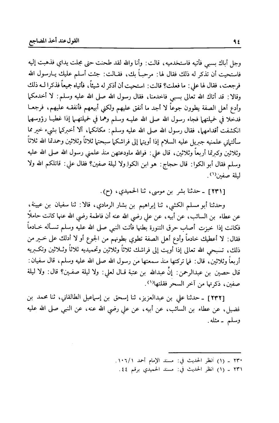 231 - حَدَّثَنَا بِشْرُ بْنُ مُوسَى، ثنا الْحُمَيْدِيُّ، ح وَحَدَّثَنَا أَبُو مُسْلِمٍ الْكَشِّيُّ، ثنا إِبْرَاهِيمُ بْنُ بَشَّارٍ الرَّمَادِيُّ، قَالَا: ثنا سُفْيَانُ بْنُ عُيَيْنَةَ، عَنْ عَطَاءِ بْنِ السَّائِبِ، عَنْ أَبِيهِ، عَنْ عَلِيٍّ، رَضِيَ اللَّهُ عَنْهُ أَنَّ فَاطِمَةَ، رَضِيَ اللَّهُ عَنْهَا كَانَتْ حَامِلًا فَكَانَتْ إِذَا خَبَزَتْ أَصَابَ حَرْقُ التَّنُّورَةِ بَطْنَهَا، فَأَتَتِ النَّبِيَّ صَلَّى اللهُ عَلَيْهِ وَسَلَّمَ تَسْأَلُهُ خَادِمًا، فَقَالَ: «لَا أُعْطِيكِ خَادِمًا وَأَدَعُ أَهْلَ الصُّفَّةِ تُطْوَى بُطُونُهُمْ مِنَ الْجُوعِ، أَوَلَا أَدُلُّكِ عَلَى خَيْرٍ مِنْ ذَلِكَ، §تُسَبِّحِي اللَّهَ تَعَالَى إِذَا أَوَيْتِ إِلَى فِرَاشِكِ ثَلَاثًا وَثَلَاثِينَ، وَتَحْمَدِيهِ ثَلَاثًا وَثَلَاثِينَ، وَتُكَبِّرِيهِ أَرْبَعًا وَثَلَاثِينَ» قَالَ: فَمَا تَرَكْتُهَا مُنْذُ سَمِعْتُهَا مِنْ رَسُولِ اللَّهِ صَلَّى اللهُ عَلَيْهِ وَسَلَّمَ قَالَ سُفْيَانُ: قَالَ حُصَيْنُ بْنُ عَبْدِ الرَّحْمَنِ: إِنَّ عَبْدَ اللَّهِ بْنَ عُتْبَةَ قَالَ لِعَلِيٍّ: وَلَا لَيْلَةَ صِفِّينَ؟ قَالَ: وَلَا لَيْلَةَ صِفِّينَ، ذَكَرْتُهَا مِنْ آخِرِ السَّحَرِ فَقُلْتُهَا