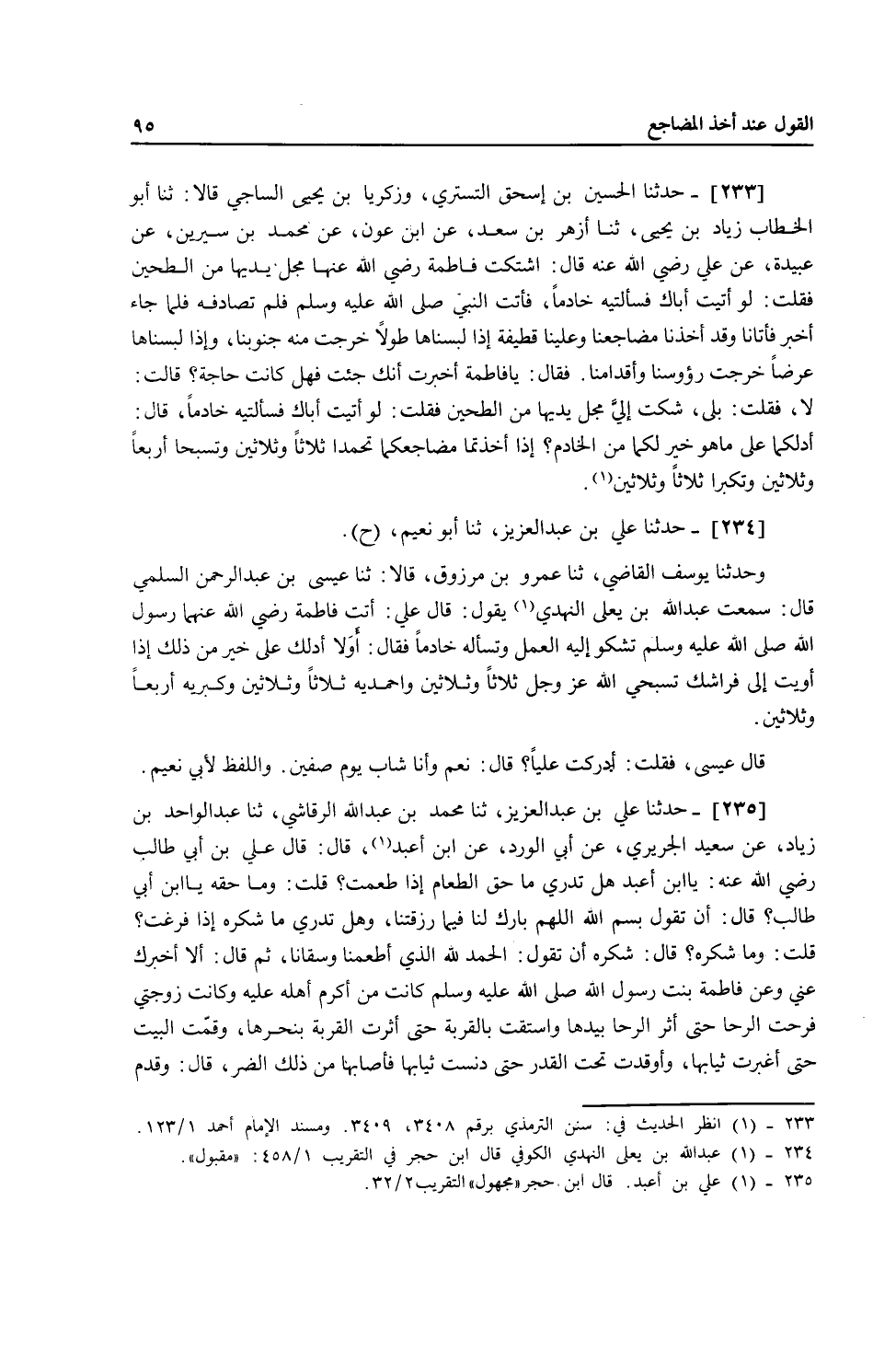 233 - حَدَّثَنَا الْحُسَيْنُ بْنُ إِسْحَاقَ التُّسْتَرِيُّ، وَزَكَرِيَّا بْنُ يَحْيَى السَّاجِيُّ، قَالَا: ثنا أَبُو الْخَطَّابِ زِيَادُ بْنُ يَحْيَى، ثنا أَزْهَرُ بْنُ سَعْدٍ، عَنِ ابْنِ عَوْنٍ، عَنْ مُحَمَّدِ بْنِ سِيرِينَ، عَنْ عُبَيْدَةَ، عَنْ عَلِيٍّ، رَضِيَ اللَّهُ عَنْهُ قَالَ: اشْتَكَتْ فَاطِمَةُ رَضِيَ اللَّهُ عَنْهَا مَجْلَ يَدَيْهَا مِنَ الطَّحِينِ، فَقُلْتُ: لَوْ أَتَيْتِ أَبَاكِ فَسَأَلْتِيهِ خَادِمًا، فَأَتَتِ النَّبِيَّ صَلَّى اللهُ عَلَيْهِ وَسَلَّمَ فَلَمْ تُصَادِفْهُ فَلَمَّا جَاءَ أُخْبِرَ فَأَتَانَا وَقَدْ أَخَذْنَا مَضَاجِعَنَا وَعَلَيْنَا قَطِيفَةٌ إِذَا لَبِسْنَاهَا طُولًا خَرَجَتْ مِنْهُ جُنُوبَنَا، وَإِذَا لَبِسْنَاهَا عَرْضًا خَرَجَتْ رُءُوسُنَا وَأَقْدَامُنَا، فَقَالَ: «يَا فَاطِمَةُ أُخْبِرْتُ أَنَّكِ جِئْتِ فَهَلْ كَانَتْ حَاجَةٌ؟» قَالَتْ: لَا، فَقُلْتُ: بَلَى، شَكَتْ إِلَيَّ مَجْلَ يَدَيْهَا مِنَ الطَّحِينِ، فَقُلْتُ: لَوْ أَتَيْتِ أَبَاكِ فَسَأَلْتِيهِ خَادِمًا قَالَ: «أَدُلُّكُمَا عَلَى مَا هُوَ خَيْرٌ لَكُمَا مِنَ الْخَادِمِ، §إِذَا أَخَذْتُمَا مَضَاجِعَكُمَا تَحْمَدَا ثَلَاثًا وَثَلَاثِينَ وَتُسَبِّحَا أَرْبَعًا وَثَلَاثِينَ وَتُكَبِّرَا ثَلَاثًا وَثَلَاثِينَ»