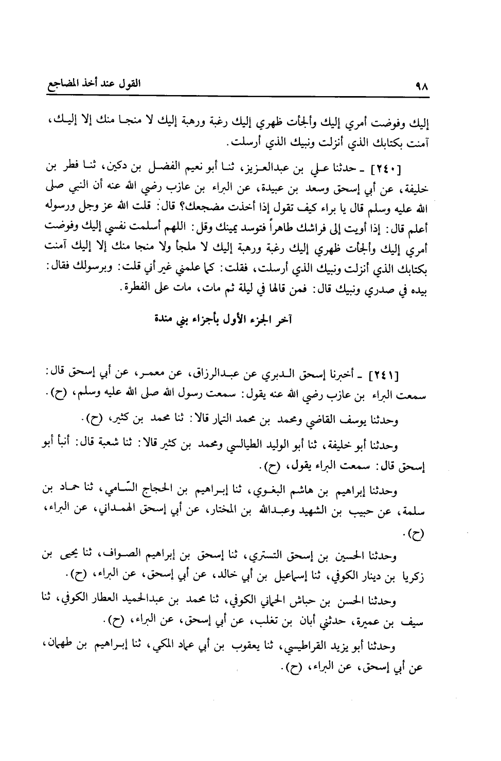 242 - أَخْبَرَنَا إِسْحَاقُ الدَّبَرِيُّ، عَنْ عَبْدِ الرَّزَّاقِ، عَنْ مَعْمَرٍ، عَنْ أَبِي إِسْحَاقَ، قَالَ: سَمِعْتُ الْبَرَاءَ بْنَ عَازِبٍ، رَضِيَ اللَّهُ عَنْهُ يَقُولُ: سَمِعْتُ رَسُولَ اللَّهِ صَلَّى اللهُ عَلَيْهِ وَسَلَّمَ ح وَحَدَّثَنَا يُوسُفُ الْقَاضِي، وَمُحَمَّدُ بْنُ مُحَمَّدٍ التَّمَّارُ، قَالَا: ثنا مُحَمَّدُ بْنُ كَثِيرٍ، ح وَحَدَّثَنَا أَبُو خَلِيفَةَ، ثنا أَبُو الْوَلِيدِ الطَّيَالِسِيُّ، وَمُحَمَّدُ بْنُ كَثِيرٍ، قَالَا: ثنا شُعْبَةُ، قَالَ: أَنْبَأَ أَبُو إِسْحَاقَ، قَالَ: سَمِعْتُ الْبَرَاءَ، يَقُولُ: ح وَحَدَّثَنَا إِبْرَاهِيمُ بْنُ هَاشِمٍ الْبَغَوِيُّ، ثنا إِبْرَاهِيمُ بْنُ الْحَجَّاجِ السَّامِيُّ، ثنا حَمَّادُ بْنُ سَلَمَةَ، عَنْ حَبِيبِ بْنِ الشَّهِيدِ، وَعَبْدِ اللَّهِ بْنِ الْمُخْتَارِ، عَنْ أَبِي إِسْحَاقَ الْهَمْدَانِيِّ، عَنِ الْبَرَاءِ، ح وَحَدَّثَنَا الْحُسَيْنُ بْنُ إِسْحَاقَ التُّسْتَرِيُّ، ثنا إِسْحَاقُ بْنُ إِبْرَاهِيمَ الصَّوَّافُ، ثنا يَحْيَى بْنُ زَكَرِيَّا بْنِ دِينَارٍ الْكُوفِيُّ، ثنا إِسْمَاعِيلُ بْنُ أَبِي خَالِدٍ، عَنْ أَبِي إِسْحَاقَ، عَنِ الْبَرَاءِ، ح وَحَدَّثَنَا الْحَسَنُ بْنُ حُبَاشٍ الْحِمَّانِيُّ الْكُوفِيُّ، ثنا مُحَمَّدُ بْنُ عَبْدِ الْحَمِيدِ الْعَطَّارُ الْكُوفِيُّ، ثنا سَيْفُ بْنُ عَمِيرَةَ، حَدَّثَنِي أَبَانُ بْنُ تَغْلِبَ، عَنْ أَبِي إِسْحَاقَ، عَنِ الْبَرَاءِ، وَحَدَّثَنَا أَبُو يَزِيدَ الْقَرَاطِيسِيُّ، ثنا يَعْقُوبُ بْنُ أَبِي عِمَادٍ الْمَكِّيُّ، ثنا إِبْرَاهِيمُ بْنُ طَهْمَانَ، عَنْ أَبِي إِسْحَاقَ، عَنِ الْبَرَاءِ، ح وَحَدَّثَنَا مُحَمَّدُ بْنُ عَمْرِو بْنِ خَالِدٍ الْحَرَّانِيُّ، ثنا أَبِي، ثنا زُهَيْرٌ، عَنْ أَبِي إِسْحَاقَ، عَنِ الْبَرَاءِ، ح وَحَدَّثَنَا مُعَاذُ بْنُ الْمُثَنَّى، ثنا مُسَدَّدٌ وَحَدَّثَنَا عُبَيْدُ بْنُ غَنَّامٍ، ثنا أَبُو بَكْرِ بْنُ أَبِي شَيْبَةَ، قَالَا: ثنا أَبُو الْأَحْوَصِ، عَنْ أَبِي إِسْحَاقَ عَنِ الْبَرَاءِ ح وَحَدَّثَنَا أَحْمَدُ بْنُ مُحَمَّدِ بْنِ يَحْيَى بْنِ حَمْزَةَ ثنا أَبِي، عَنْ أَبِيهِ، حَدَّثَنِي ثَوْرُ بْنُ يَزِيدَ، عَنْ عَمْرِو بْنِ قَيْسٍ، عَنْ أَبِي إِسْحَاقَ، عَنِ الْبَرَاءِ، ح وَحَدَّثَنَا عَلِيُّ بْنُ عَبْدِ الْعَزِيزِ، ثنا عَبْدُ اللَّهِ بْنُ رَجَاءٍ، ثنا إِسْرَائِيلُ عَنْ أَبِي إِسْحَاقَ عَنِ الْبَرَاءِ ح وَحَدَّثَنَا عَبْدَانُ بْنُ أَحْمَدَ ثنا عُبَيْدُ اللَّهِ بْنُ سَعْدٍ، ثنا عَمِّي، ثنا أَبِي، عَنِ ابْنِ إِسْحَاقَ، ثنا أَبُو إِسْحَاقَ السَّبِيعِيُّ، عَنِ الْبَرَاءِ، ح وَحَدَّثَنَا مُعَاذُ بْنُ الْمُثَنَّى، ثنا عَلِيُّ بْنُ الْمَدِينِيِّ، وَحَدَّثَنَا عَبْدَانُ بْنُ أَحْمَدَ، ثنا عُثْمَانُ بْنُ أَبِي شَيْبَةَ، زَيْدُ بْنُ الْحَرِيشِ، قَالُوا: ثنا سُفْيَانُ بْنُ عُيَيْنَةَ، عَنْ أَبِي إِسْحَاقَ، عَنِ الْبَرَاءِ، ح وَحَدَّثَنَا إِبْرَاهِيمُ بْنُ عَبْدِ السَّلَامِ الْبَغْدَادِيُّ، ثنا مُحَمَّدُ بْنُ نَافِعٍ الطَّحَّانُ الْمِصْرِيُّ، ثنا عَبْدُ اللَّهِ بْنُ مُحَمَّدِ بْنِ الْمُغِيرَةِ، ثنا مَعْمَرٌ، عَنْ أَبِي إِسْحَاقَ، عَنِ الْبَرَاءِ، رَضِيَ اللَّهُ عَنْهُ قَالَ: سَمِعْتُ رَسُولَ اللَّهِ صَلَّى اللهُ عَلَيْهِ وَسَلَّمَ يَأْمُرُ رَجُلًا إِذَا أَخَذَ مَضْجَعَهُ مِنَ اللَّيْلِ أَنْ يَقُولَ: §اللَّهُمَّ أَسْلَمْتُ نَفْسِي إِلَيْكَ، وَوَجَّهْتُ وَجْهِي إِلَيْكَ، وَفَوَّضْتُ أَمْرِي إِلَيْكَ، وَأَلْجَأْتُ ظَهْرِي إِلَيْكَ، رَغْبَةً وَرَهْبَةً إِلَيْكَ، لَا مَلْجَأَ وَلَا مَنْجَا مِنْكَ إِلَّا إِلَيْكَ، آمَنْتُ بِكِتَابِكَ الَّذِي أَنْزَلْتَ وَبِرَسُولِكَ الَّذِي أَرْسَلْتَ فَإِنْ مَاتَ مِنْ لَيْلَتِهِ مَاتَ عَلَى الْفِطْرَةِ، وَإِ