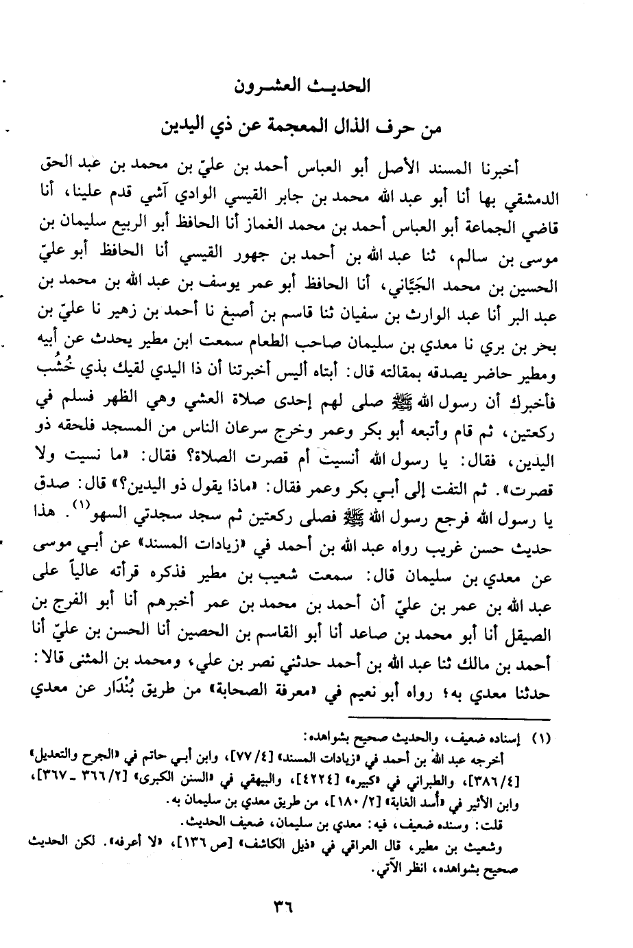 الحَدِيث الْعشْرُونَ من حرف الذَّال الْمُعْجَمَة عَن ذِي الْيَدَيْنِ