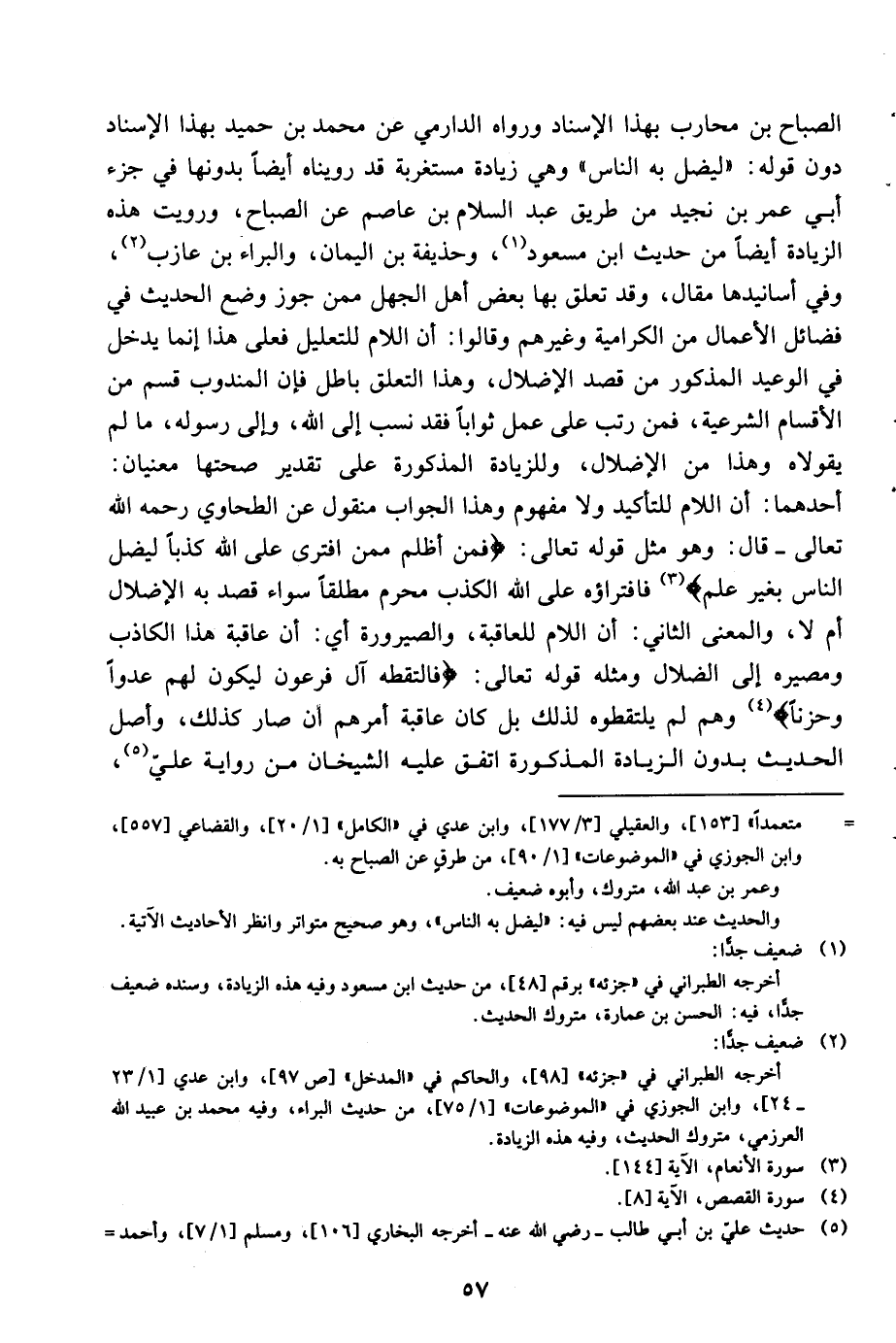الصَّبَّاحُ بْنُ مُحَارِبٍ بِهَذَا الإِسْنَادِ وَرَوَاهُ الدَّارمِيّ عَن مُحَمَّد بن حميد بِهَذَا الْإِسْنَاد دون قَوْله (ليضل بِهِ النَّاس) وَهِي زِيَادَة مستغربة قد روينَاهُ أَيْضا بِدُونِهَا فِي جُزْء أبي عمر بْنِ نُجَيْدٍ مِنْ طَرِيقِ عَبْدِ السَّلَام بن عَاصِم عَن الصَّباح وَرويت هَذِه الزِّيَادَة أَيْضًا مِنْ حَدِيثِ ابْنِ مَسْعُودٍ // ضَعِيف جدا // وَحُذَيْفَةَ بْنِ الْيَمَانِ وَالْبَرَاءِ بْنِ عَازِب // ضَعِيف جدا // وَفِي أسانيدها مَقَالٌ وَقَدْ تَعَلَّقَ بِهَا بَعْضُ أهل الْجَهْل مِمَّن جوز وَضْعَ الْحَدِيثِ فِي فَضَائِلِ الأَعْمَالِ من الكرامية وَغَيرهم وَقَالُوا أَن اللَّام للتَّعْلِيل فعلى هَذَا إِنَّمَا يدْخل فِي الْوَعيد الْمَذْكُور من قصد الإضلال وَهَذَا التَّعَلُّق بَاطِلٌ فَإِنَّ الْمَنْدُوبَ قِسْمٌ مِنَ الْأَقْسَام الشَّرْعِيَّةِ فَمَنْ رَتَّبَ عَلَى عَمَلٍ ثَوَابًا فَقَدْ نَسَبَ إِلَى اللَّهِ وَإِلَى رَسُولِهِ مَا لَمْ يَقُولاهُ وَهَذَا مِنَ الإِضْلالِ وَللزِّيَادَةِ الْمَذْكُورَةِ على تَقْدِير صِحَّتهَا مَعْنيانِ أَحدهمَا أَن اللَّام للتَّأْكِيد وَلَا مَفْهُوم وَهَذَا الْجَواب مَنْقُول عَن الطَّحَاوِيّ رَحمَه الله تَعَالَى قَالَ وَهُوَ مثل قَوْله تَعَالَى {فَمَنْ أَظْلَمُ مِمَّنِ افْتَرَى عَلَى اللَّهِ كَذِبًا لِيُضِلَّ النَّاسَ بِغَيْر علم} فافتراؤه على الله الْكَذِب مُحَرَّمٌ مُطْلَقًا سَوَاءَ قَصَدَ بِهِ الإِضْلالَ أَمْ لَا وَالْمَعْنَى الثَّانِي أَنَّ اللامَ لِلْعَاقِبَةِ وَالصَّيْرُورَةِ أَيْ إِنَّ عَاقِبَةَ هَذَا الْكَاذِبِ وَمَصِيرَهُ إِلَى الضلال وَمِثْلُهُ قَوْلُهُ تَعَالَى {فَالْتَقَطَهُ آلُ فِرْعَوْنَ لِيَكُونَ لَهُمْ عَدُوًّا وَحَزَنًا} وَهُمْ لَمْ يَلْتَقِطُوهُ لِذَلِكَ بَلْ كَانَ عَاقِبَةُ أَمْرِهِمْ أَنْ صَارَ كَذَلِك وأصل الحَدِيث بِدُونِ الزِّيَادَة الْمَذْكُورَة اتَّفَقَ عَلَيْهِ الشَّيْخَانِ مِنْ رِوَايَةِ عَليّ