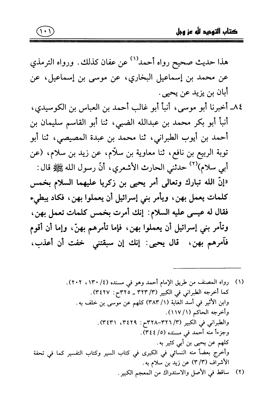 84 - أخبرنا أبو موسى، أنبا أبو غالب أحمد بن العباس الكوشيذي، أنبا أبو بكر محمد بن عبد الله أحمد الصوفي، نا أبو القاسم سليمان بن أحمد بن أيوب الطبراني، ثنا محمد بن عبدة المصيصي، ثنا أبو توبة الربيع بن نافع، ثنا معاوية بن سلام، عن زيد بن سلام، حدثني الحارث الأشعري، أن رسول الله صَلَّى اللهُ عَلَيْهِ وَسَلَّمَ، قال: " إِنَّ اللَّهَ تَبَارَكَ وَتَعَالَى أَمَرَ يَحْيَى بْنَ زَكَرِيَّا عَلَيْهِمَا السَّلامُ بِخَمْسِ كَلِمَاتٍ، يَعْمَلُ بِهِنَّ، وَيَأْمُرُ بَنِي إِسْرَائِيلَ يَعْمَلُوا بِهِنَّ، فَكَادَ يُبْطِئُ، فَقَالَ لَهُ عِيسَى عَلَيْهِ السَّلامُ: إِنَّكَ قَدْ أُمِرْتَ بِخَمْسِ كَلِمَاتٍ تَعْمَلُ بِهِنَّ، وَتَأْمُرُ بَنِي إِسْرَائِيلَ أَنْ يَعْمَلُوا بِهِنَّ، فَإِمَّا تَأْمُرُهُمْ بِهِنَّ، وَإِمَّا أَنْ أَقُومَ فَآمُرُهُمْ بِهِنَّ، قَالَ يَحْيَى: إِنَّكَ إِنْ سَبَقْتَنِي خِفْتُ أَنْ أُعَذَّبَ،