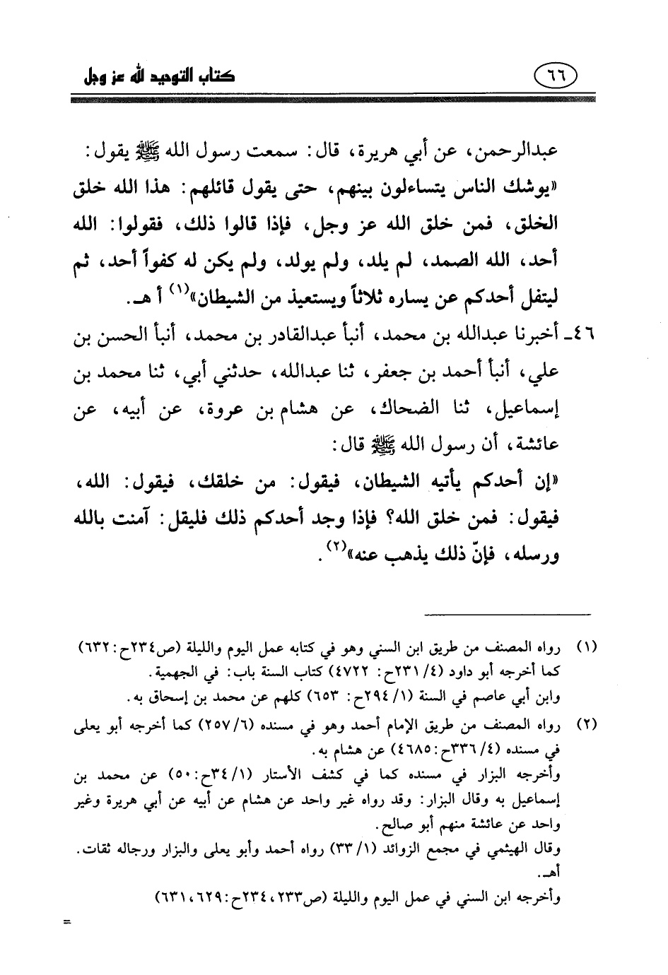 46 - أَخْبَرَنَا عَبْدُ اللَّهِ بْنُ مُحَمَّدٍ، أنبا عَبْدُ الْقَادِرِ بْنُ مُحَمَّدٍ، أنبا الْحَسَنُ بْنُ عَلِيٍّ، أنبا أَحْمَدُ بْنُ جَعْفَرٍ، ثنا عَبْدُ اللَّهِ، ثنا أَبِي، أنبا مُحَمَّدُ بْنُ إِسْمَاعِيلَ، أنبا الضَّحَّاكُ، عَنْ هِشَامِ بْنِ عُرْوَةَ، عَنْ أَبِيهِ، عَنْ عَائِشَةَ " أَنَّ رَسُولَ اللَّهِ صَلَّى اللَّهُ عَلَيْهِ وَسَلَّمَ، قَالَ: " إِنَّ أَحَدَكُمْ يَأْتِيهِ الشَّيْطَانُ، فَيَقُولُ: مَنْ خَلَقَكَ؟ فَيَقُولُ: اللَّهُ.